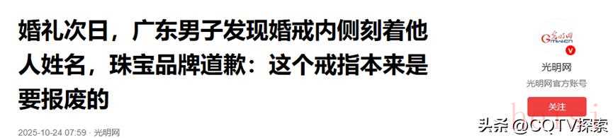 根据报道,这起事件发生在广东,一位男子在婚礼后检查婚戒时,意外发现了这个令人难以置信的刻字。这枚戒指本应是象征永恒爱情的信物,却成了揭露不信任和可能存在欺骗的导火索。