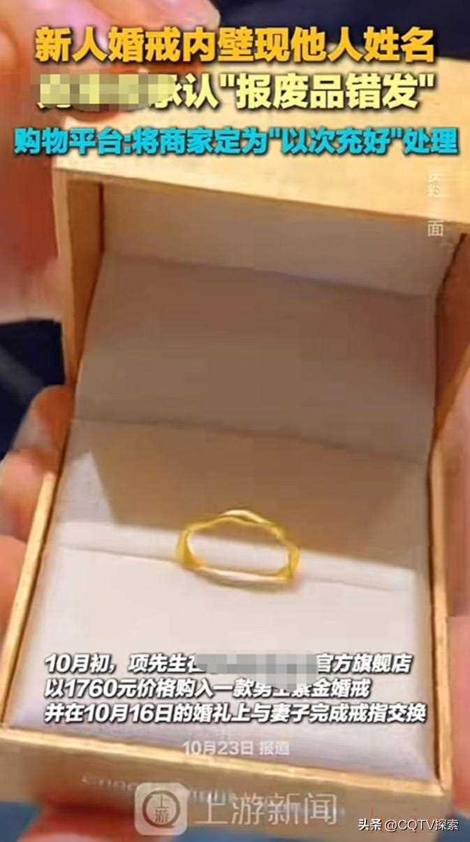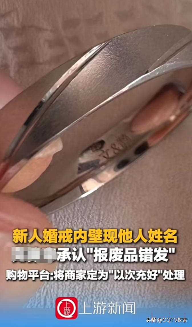 据公开信息显示,项先生是10月初在某大型电商平台上购买了一款品牌定制的男士婚戒,价格为1760元。10月16日,项先生在婚礼当天还与妻子在仪式上彼此互换了戒指。结果第二天,他因为戒圈有点紧取下来擦拭的时侯,发现戒指的内圈竟然刻有“文&静”的字样,这让他怀疑,自己佩戴的是“别人的二手婚戒”。