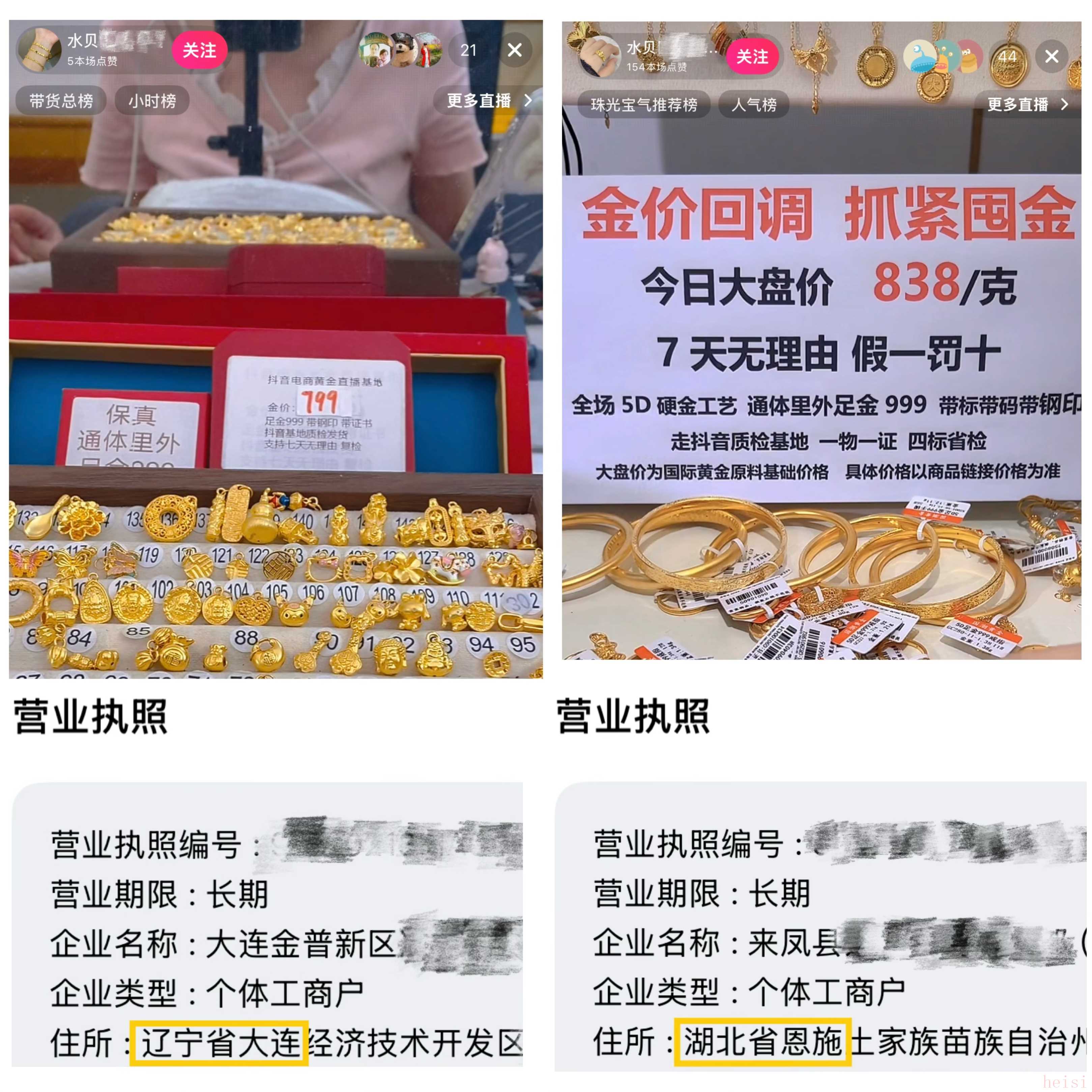 “伪旗舰店”扎根网购平台的同时,作为全国消费者耳熟能详的珠宝集聚地,水贝也成了碰瓷、擦边营销的主要对象。水贝会在电商平台搜索“水贝”关键词时发现,部分直播间以明显低于大盘金价的价格销售“黄金”商品。但查询后不难发现,这些店铺虽然名称包含“水贝”二字,营业执照中的注册地址却与水贝毫无关联。