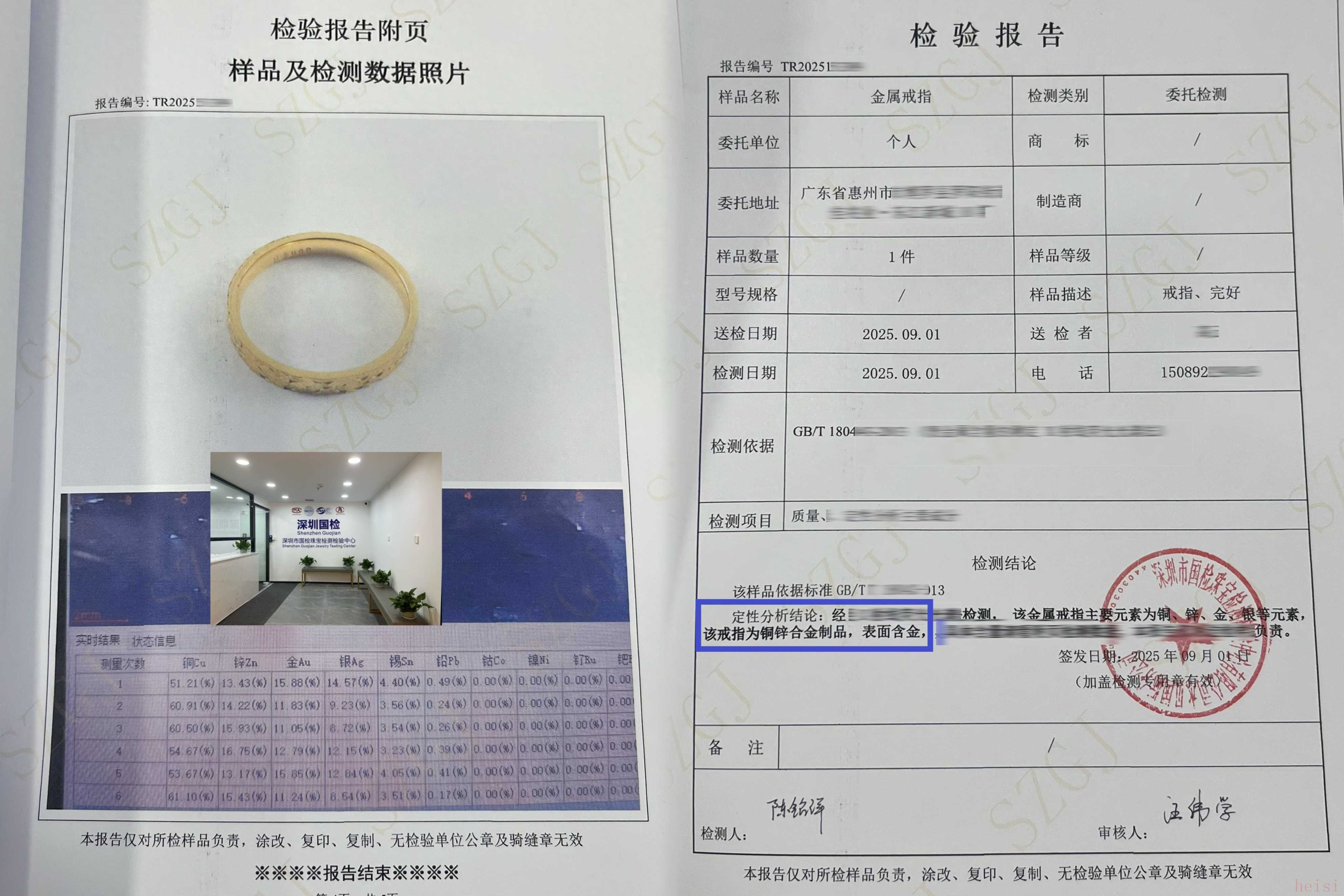 "材质不符:" 消费者购买时预期是黄金、铂金、纯银等贵金属,但收到的戒指实际是用成本较低的铜、锌合金(有时会掺杂其他金属或颜料)制作,表面可能通过电镀等手段模仿贵金属的外观。