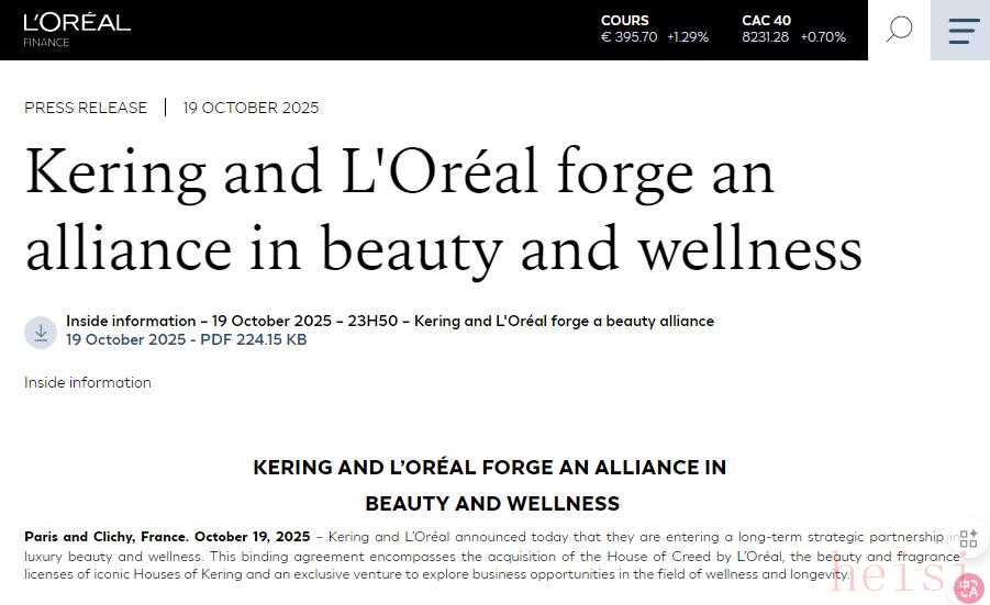 值得一提的是,前两天,欧莱雅与开云集团共同宣布,双方将在奢侈品美容与健康领域建立长期合作关系。根据协议条款,开云集团将其美妆业务以40亿欧元(约合人民币330.59亿元)的价格出售给欧莱雅。
