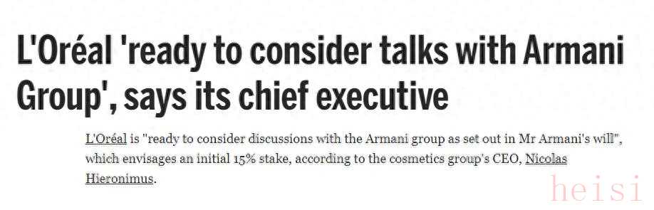同日,欧莱雅集团首席执行官Nicolas Hieronimus对外表示,欧莱雅“准备按照阿玛尼先生的遗嘱考虑与阿玛尼集团进行讨论”,该遗嘱设想最初持有15%的股份。这一发言印证了此前业内对“欧莱雅将收购阿玛尼”的推测。