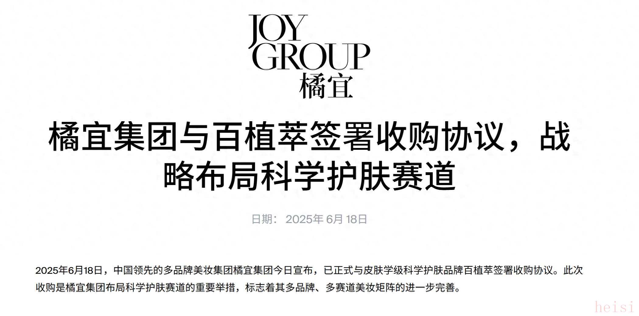 6月18日,橘朵、酵色母公司橘宜集团官网发布公告,其与皮肤学级科学护肤品牌百植萃签署收购协议。橘宜集团表示,“此次收购是集团布局科学护肤赛道的重要举措,标志着其多品牌、多赛道美妆矩阵的进一步完善。”在彩妆增长放缓、功效护肤需求激增的背景下,橘宜的布局能否成为行业新范本?