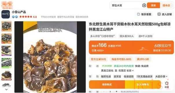 一款标称东北野生椴木秋木耳(干货)售价196元,“6·18”优惠价166元。