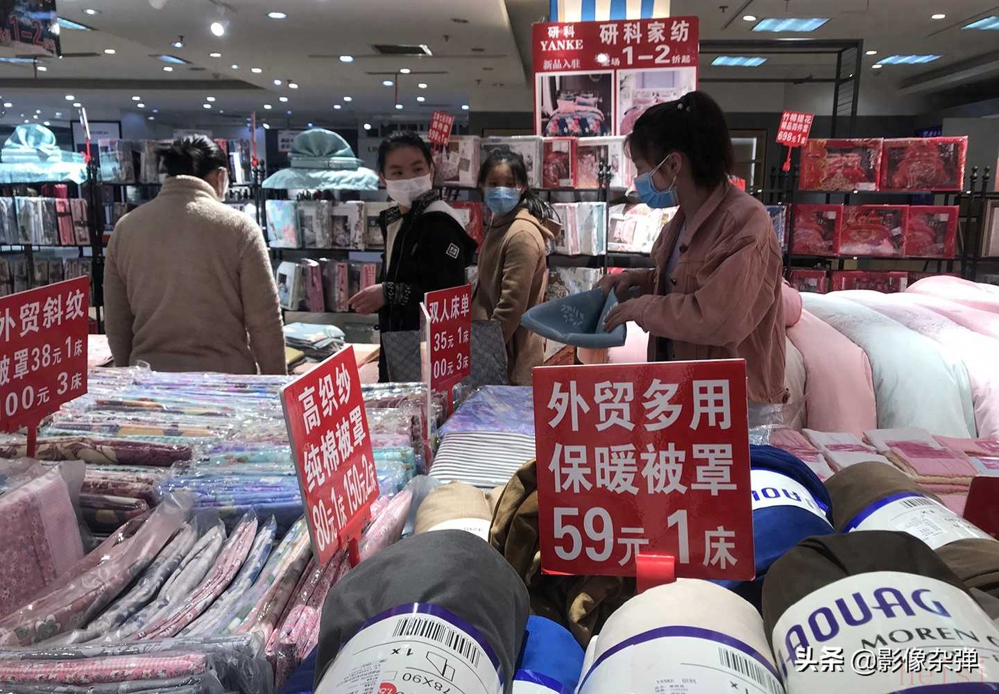 图:世代百货商场家纺和床上用品店,各种被罩低价甩卖,市民正在选购商品。