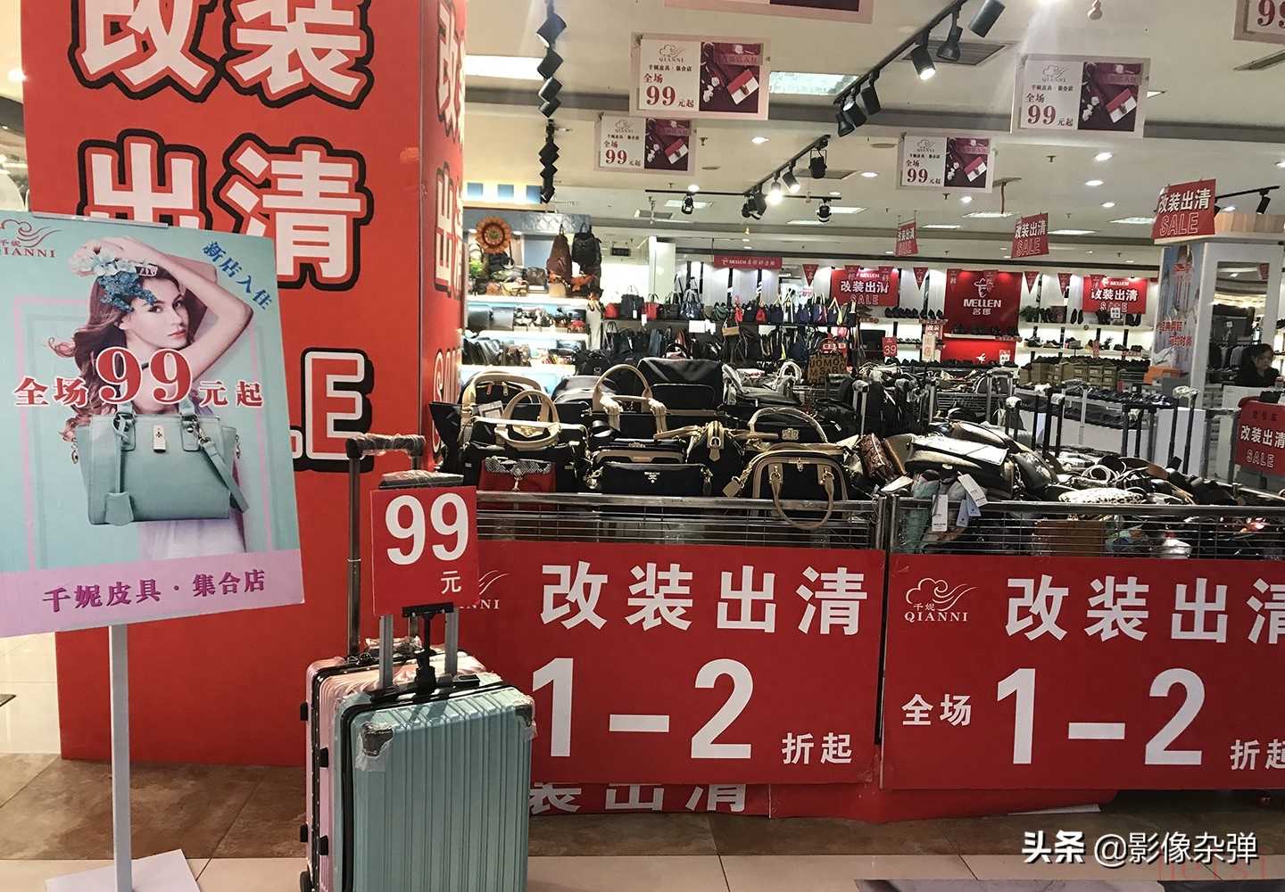 近日,北京朝阳区易世达广场世代百货开始“改装出清”,全场特价1折起,不管是服装服饰还是箱子包包,均以低价清仓处理。图:世代百货商场,箱包商家“改装出清,全场1-2折起”的标语十分醒目,而行李箱也十分实惠,只要99元。
