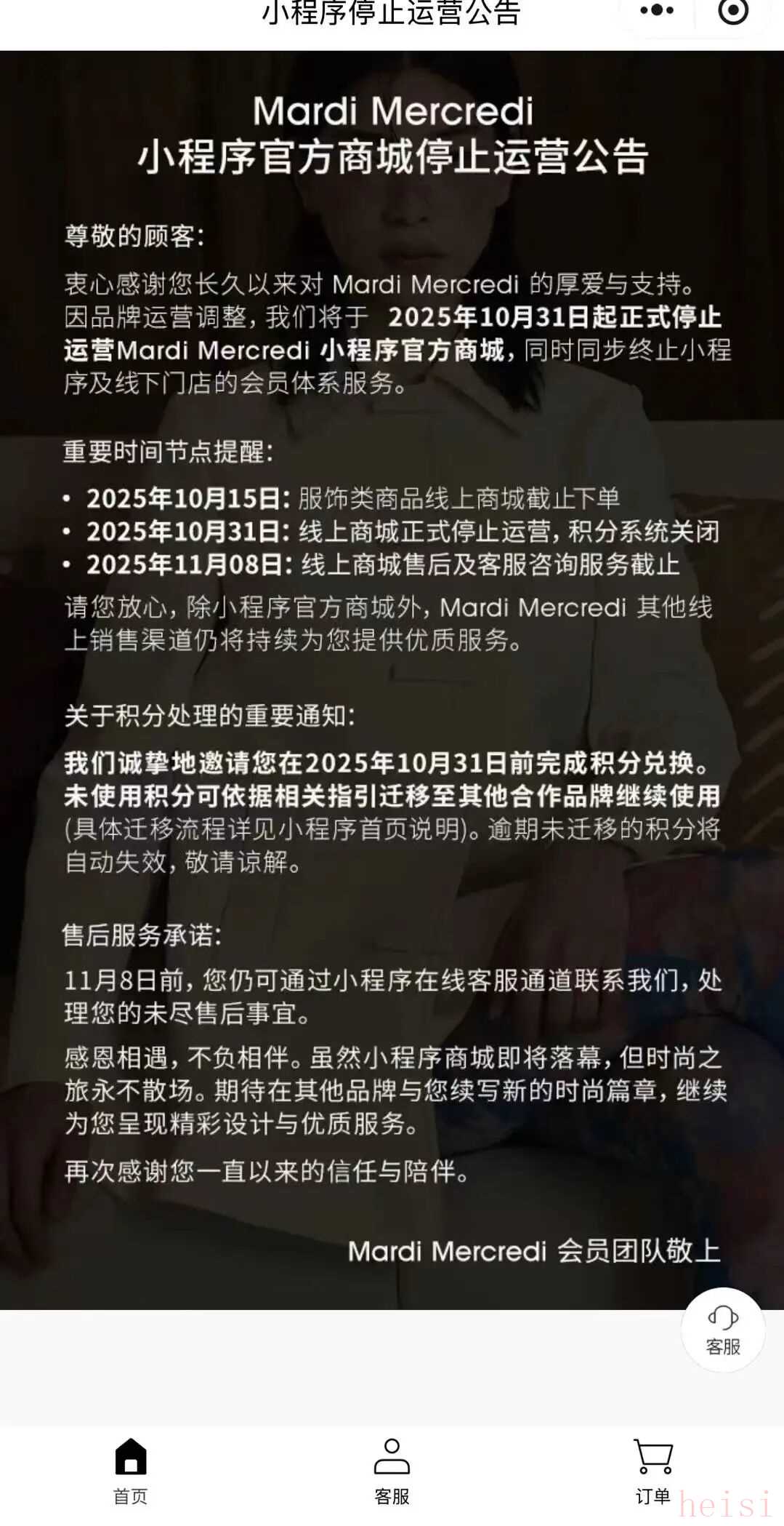 其中,服饰类商品线上商城已于10月15日截止下单;10月31日起线上商城正式停止运营,积分系统关闭;11月8日,线上商城售后及客服咨询服务将截止。