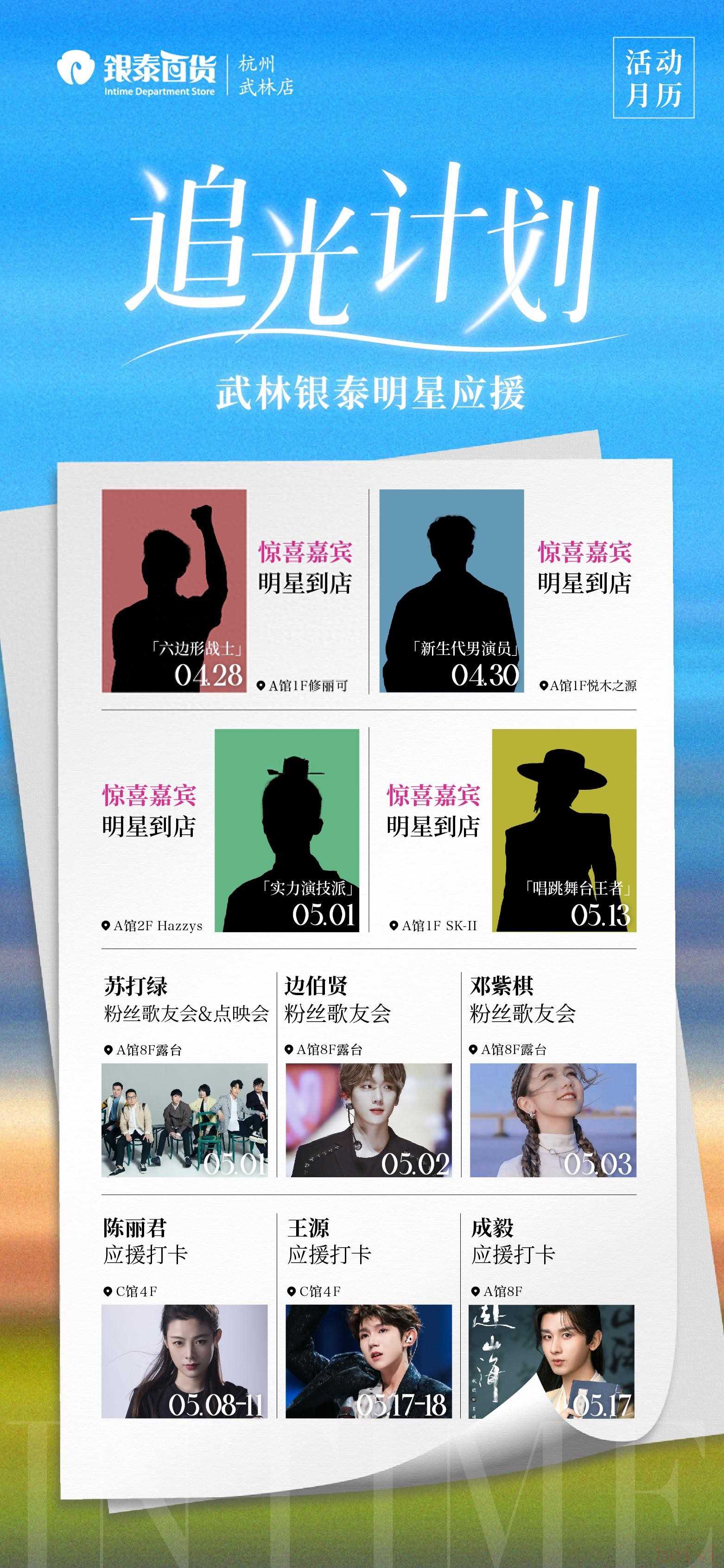 五一期间,马龙、古子成、张晚意等明星将现身武林银泰、与粉丝进行互动;同时,苏打绿、边伯贤、邓紫棋等明星的粉丝歌友也将在武林银泰举办,预计将吸引一波又一波的年轻人前去“打卡”。有网友“爆料”,整个5月武林银泰还会有多位明星到访,杭州这家商场的“星味”确实让人期待!