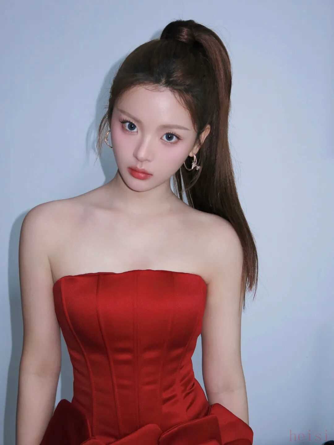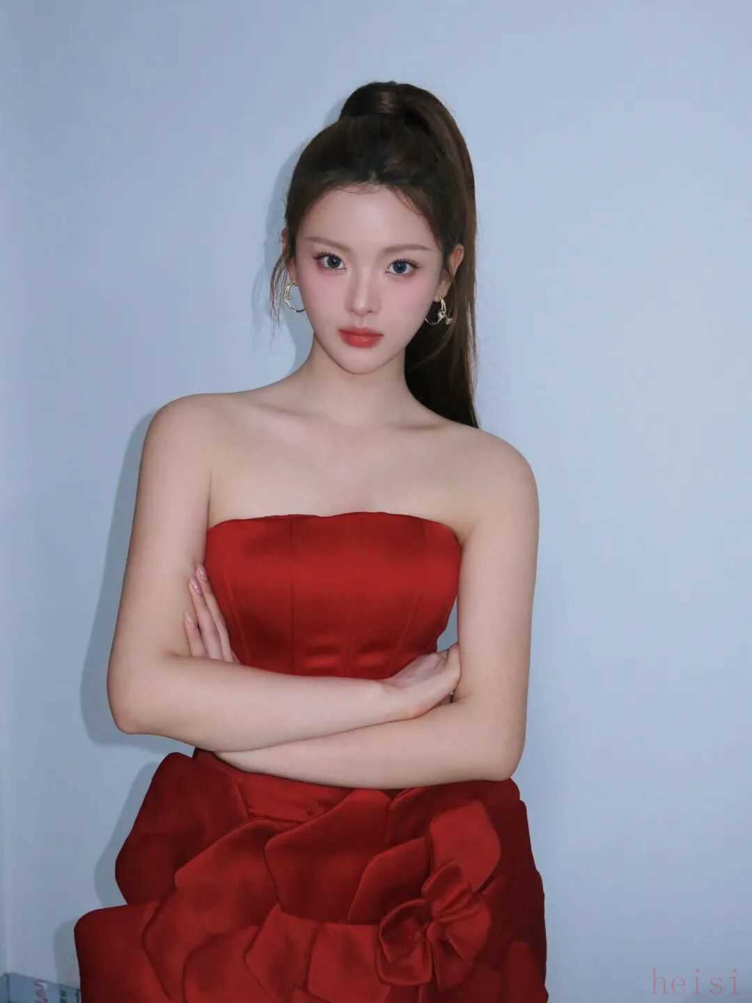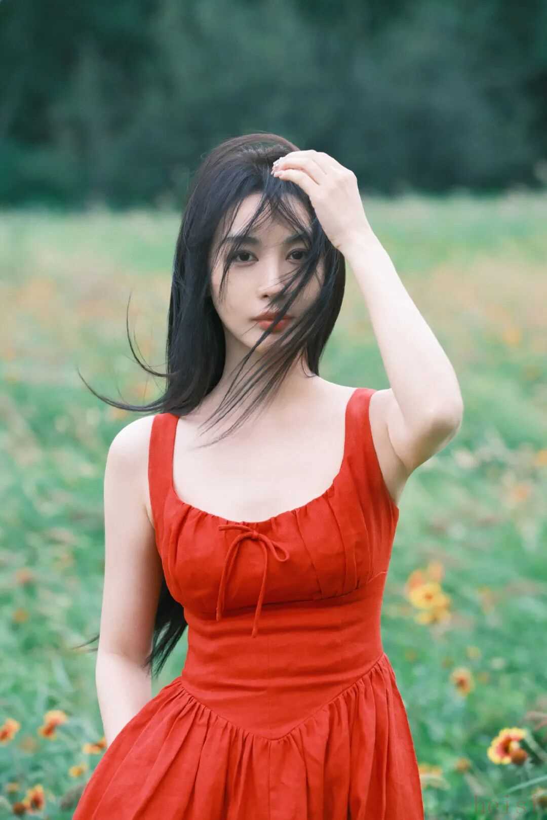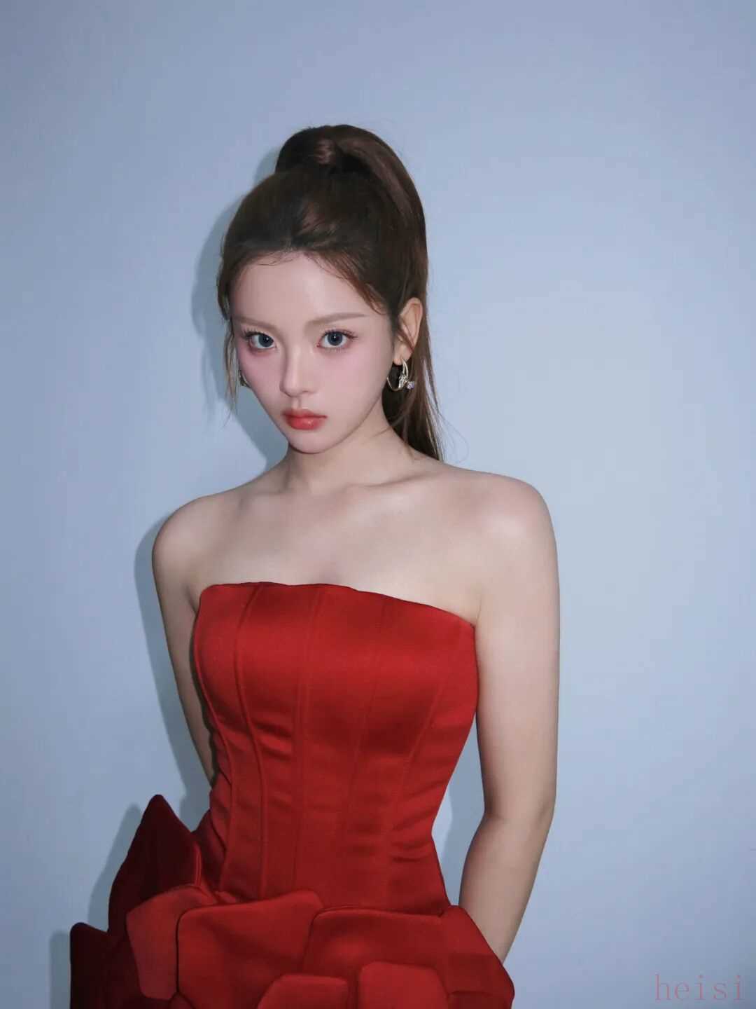 抹胸红裙的设计,大胆地展露出精致的锁骨和优美的肩部线条,凸显女性魅力。红色鲜艳夺目,不仅衬托出她白皙的肌肤,更增添了热情、活泼且高贵的气质。整体穿搭时尚大方,将她的青春靓丽与优雅气质完美融合。