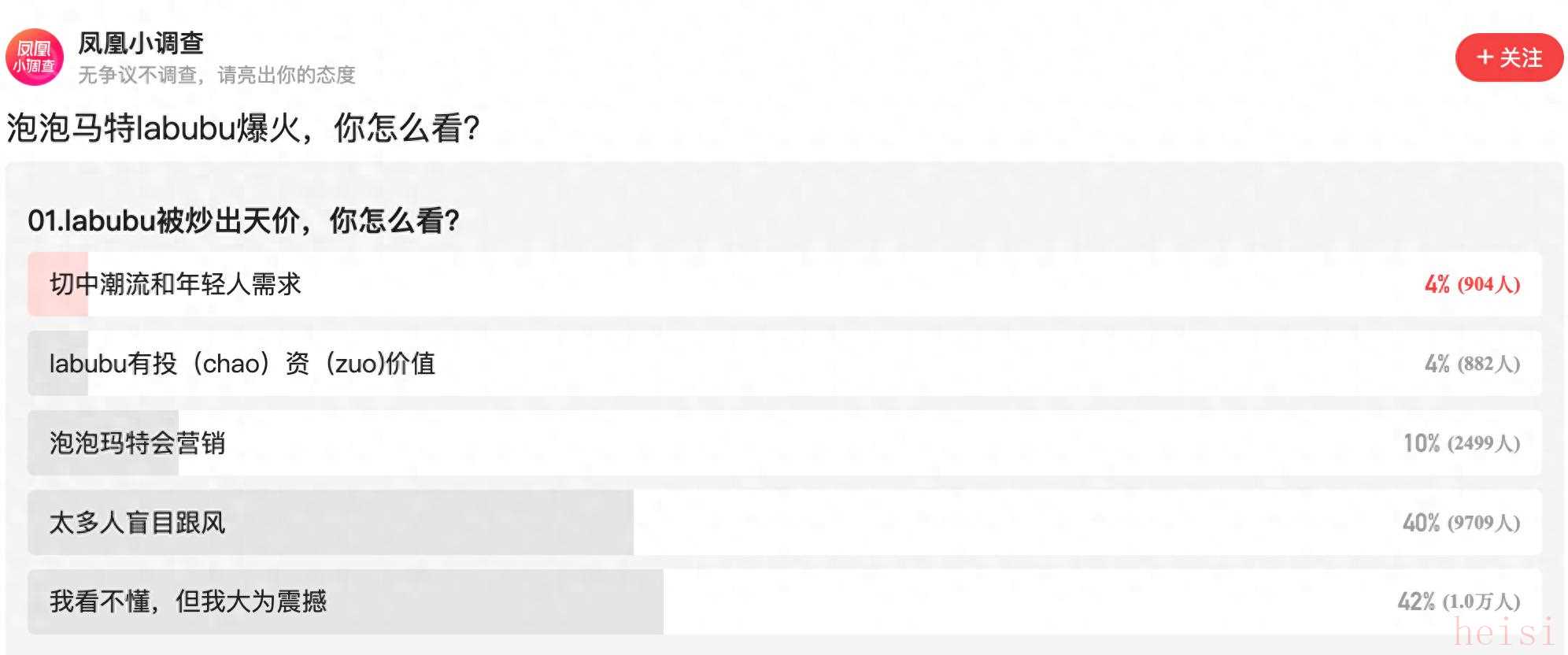 凤凰网对此做了一个小调查,对于Labubu被炒出天价,4%的人认为是因为切中潮流和年轻人需求,40%的人认为是“太多人盲目跟风”,42%的人表示“我看不懂,但我大为震撼”。