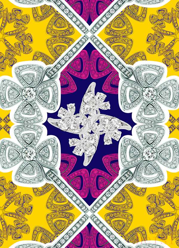 曾经,宝格丽在其Sapphire Flower蓝宝石花系列中,淋漓尽致地体现了该品牌设计的精髓—— 色彩。花瓣以不同色彩的蓝宝石构成,宛如童话中的“七色花”。如今在Fiorever 咏绽系列中,宝格丽再次演绎了一种并不存在的花卉。盛开的内外各四瓣花朵,呈现独特的八瓣造型—— 其图案来自庞贝古城的精美壁画,传递着罗马人热情欢愉的生活态度。其独特魅力藏在向上微翘并采用不对称设计的花瓣中,源于高级珠宝的“颤动式(en tremblant)”镶嵌工艺,令内层的四瓣花朵能够随着身体的律动而微微颤动,更显得轻盈灵动。虽明知这栩栩如生的动人姿态世间难觅,依然令人情不自禁地想一抚芳泽。
