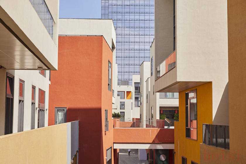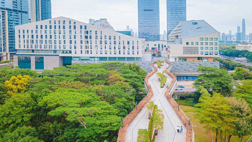 深业上城可以被看作是一个大型城市综合体,项目囊括了传统办公楼、文化东方酒店、高端住宅以及商场等。其商业部分在规划之初在深圳是大胆而具突破性的,比如购物中心楼体上方设计了一个屋顶小镇,由二十多栋3-4层的小型建筑组合成村落,各组组团聚集,并且通过高架桥联通了福田CBD区中最中心的莲花山公园。