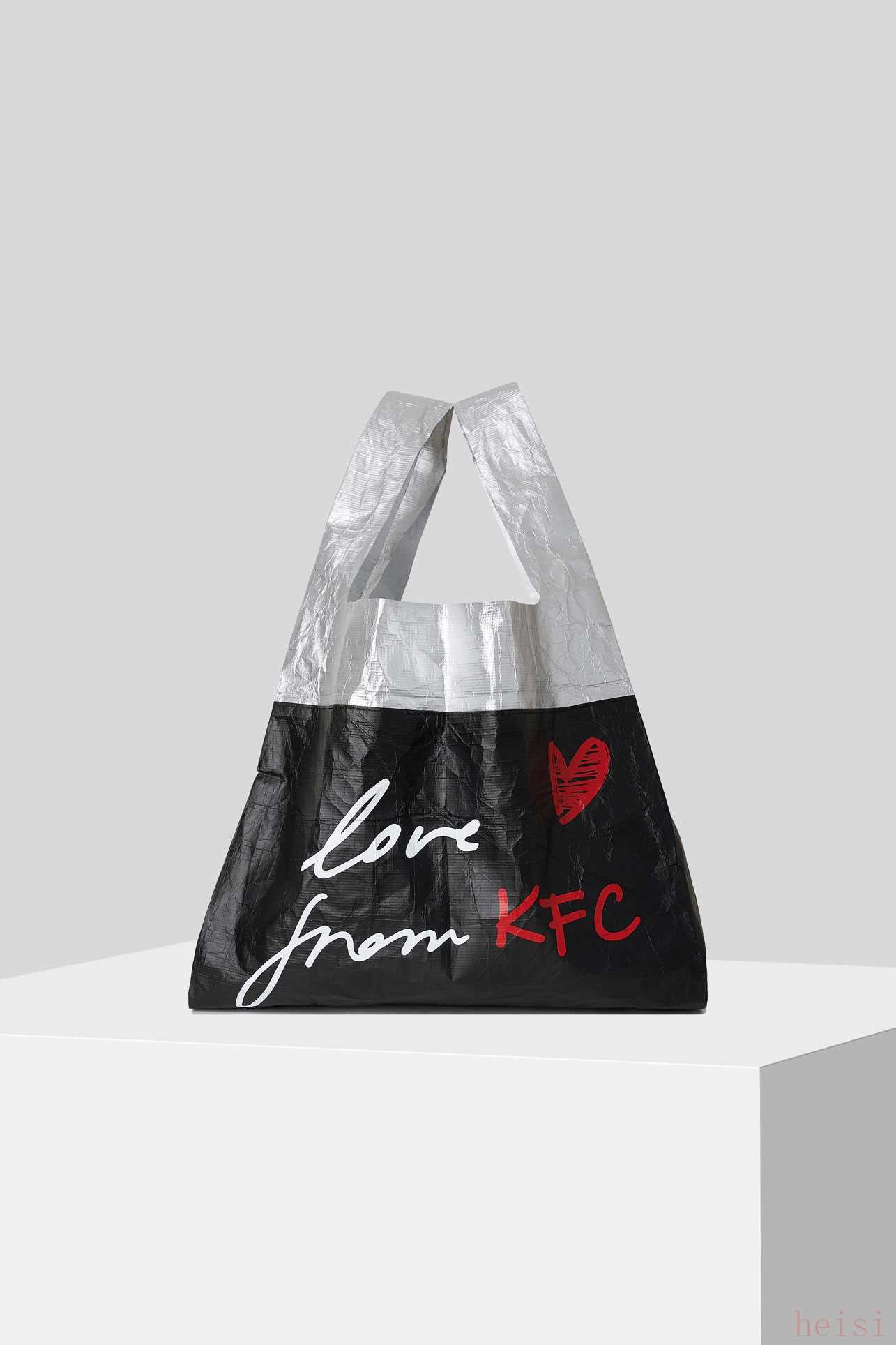 另外一款随性开封袋则是肯德基外带塑料袋的复刻版。虽然它毫无疑问地会在社交媒体上引来吐槽,但说真的,这可能是整个下半年最拉风的”塑料袋“了。联名双方在这里使用经过特殊处理的杜邦纸来制作,同时保证了塑料袋纹理的逼真性和其使用过程中的耐用性。“who is kk”和“love from KFC”字样的点缀为包袋增添了时髦性,也与联名双方强调的趣味态度相契合。