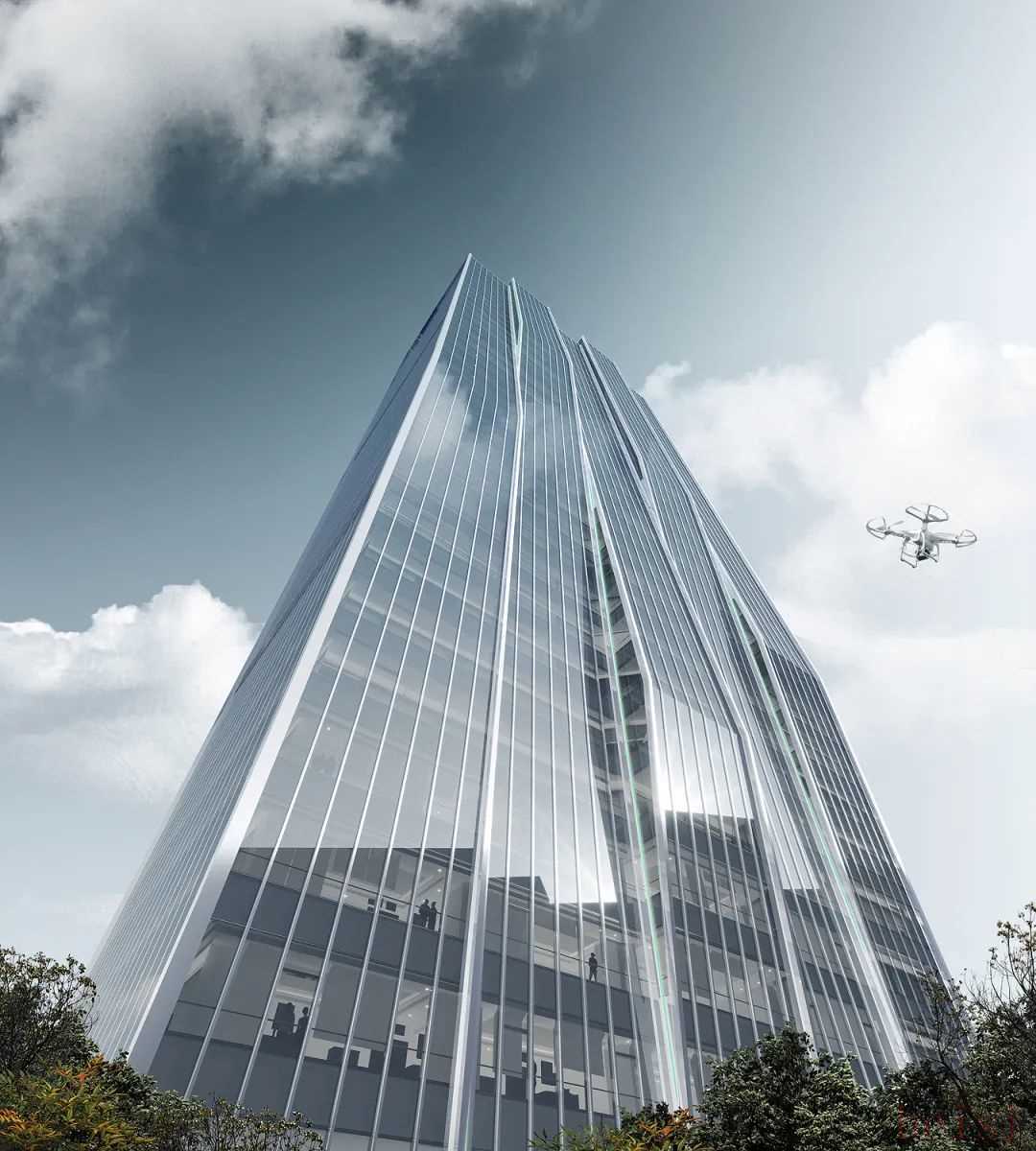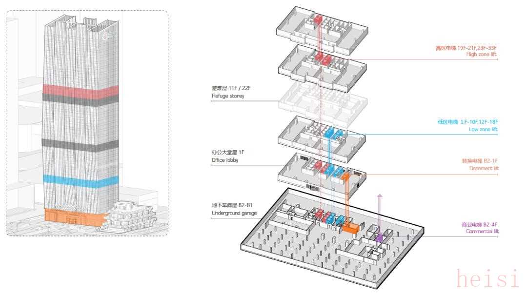 为满足金融科技企业的功能需求,AUD设计了双区垂直交通系统:- 塔楼划分为高低两区,各配置5部专属电梯,提升高峰时段运力