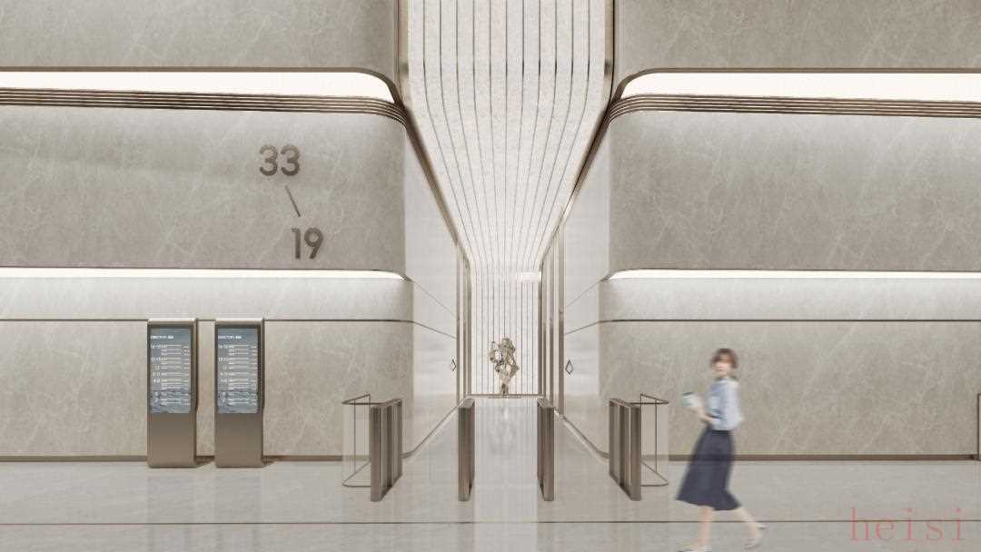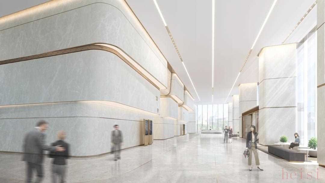 室内设计则以现代简约风格为基调,大堂地面采用金属嵌条勾勒出流畅的线条,与天花线性灯带相呼应,营造出"上善若水"的动态视觉效果。核心筒选用米灰岩板打造富有雕塑感的造型,通过简洁利落的几何形态展现现代建筑的精致质感。