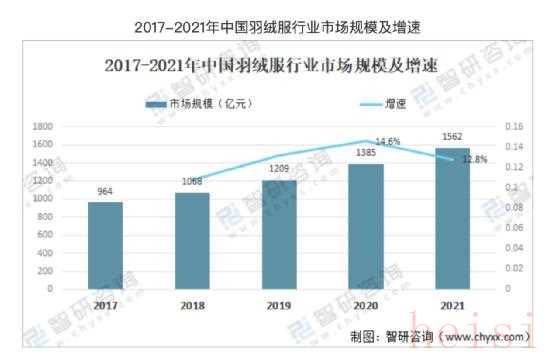 根据智研咨询研究报告指出,2021年中国羽绒服行业市场规模约1562亿元,同比增长12.8%。