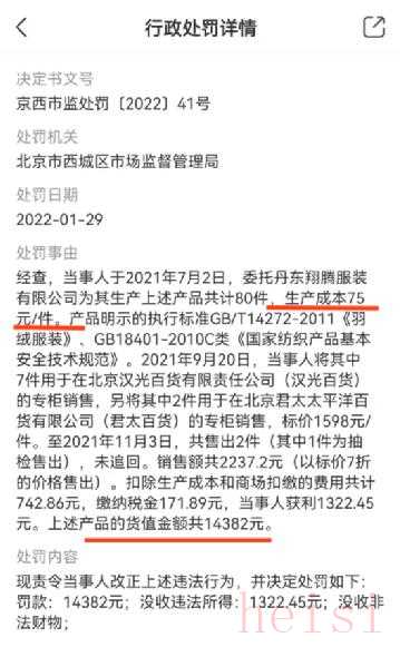 近日,根据天眼查信息显示,韩国衣恋集团在中国的注册公司衣念(上海)时装贸易有限公司因以次充好被罚。该批次羽绒服成本价为75元/件,专柜标价却高达1598元/件,吊牌溢价竟高达20倍。对此,北京市西城区市场监督管理局对其处以罚款14382元。