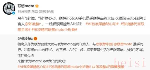【CNMO科技消息】10月14日,CNMO注意到,联想moto官方微博发文称,演员张凌赫成为联想品牌大使与联想moto品牌代言人,并配文:“AI有‘凌’犀,‘赫’然心动,一起解锁超能热AI时刻。张凌赫在微博中表示:“很高兴成为联想品牌大使与联想moto品牌代言人,将与联想moto AI手机、AI平板、AIPC一起,探索智慧生活的无限可能。