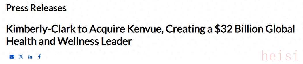 财联社11月3日讯(编辑 赵昊)美国健康卫生护理巨头金佰利(Kimberly-Clark)宣布,与另一家巨头科赴(Kenvue)达成协议,将以约487亿美元的价格并购后者,打造一家消费必需品领域的超级巨头。
