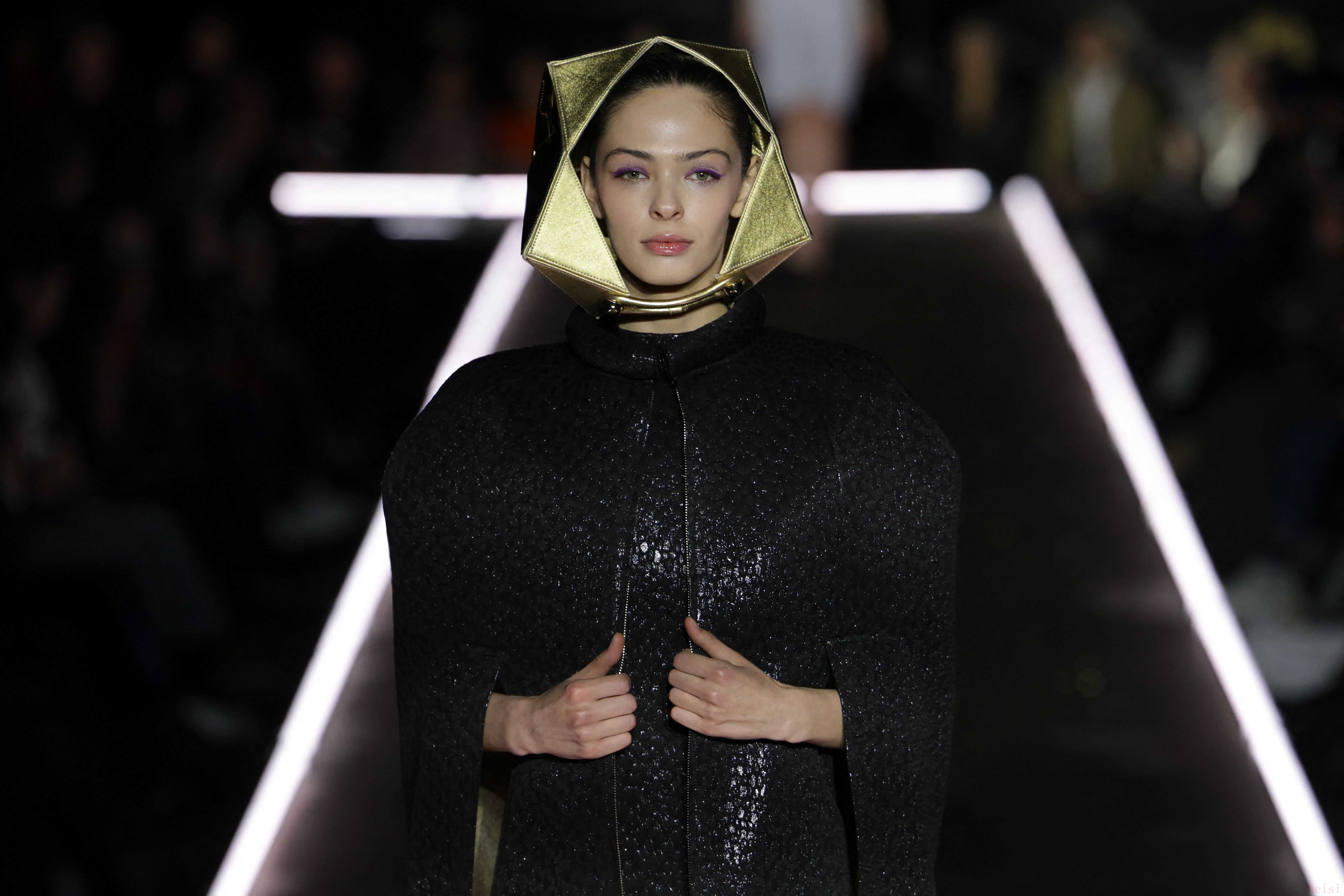 3月10日,模特在法国巴黎时装周上展示皮尔·卡丹品牌的2025/2026秋冬新款服装。新华社/法新