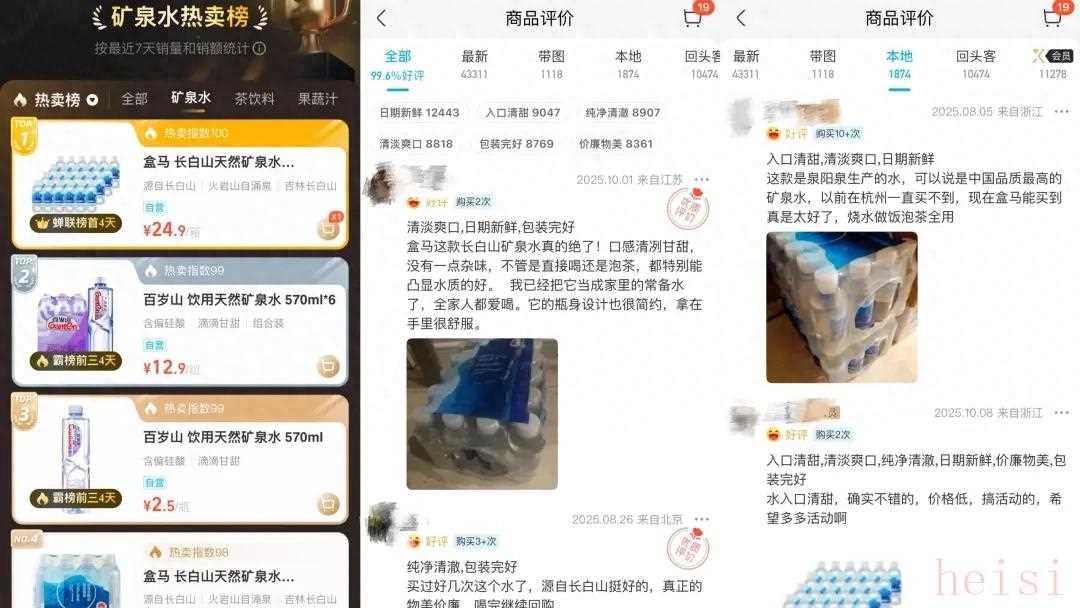 打开盒马APP,由泉阳泉生产的长白山天然矿泉水赫然排在矿泉水热卖榜的榜首,不少IP显示在南方区域的消费者也评论称,“口感清冽甘甜”“可以说是中国品质最高的矿泉水,以前在杭州一直买不到”。