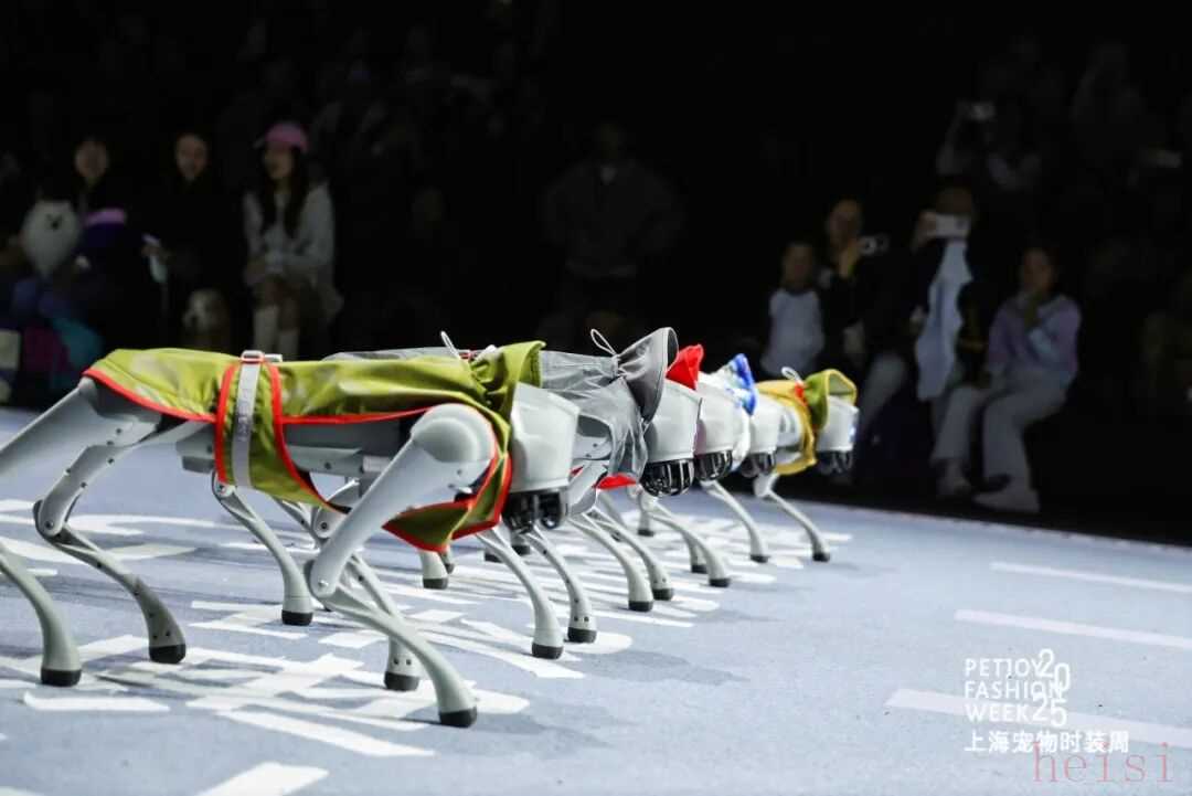 而在大秀压轴环节,五只科技感十足的机器狗惊喜登场,与活力四射的毛孩子同台演绎,将“自然野趣”与“未来科技”巧妙融合,也将现场氛围推向高潮。这一刻,我们看到的不仅是时尚的突破,更是人与宠物、自然与科技之间无界共生的可能。