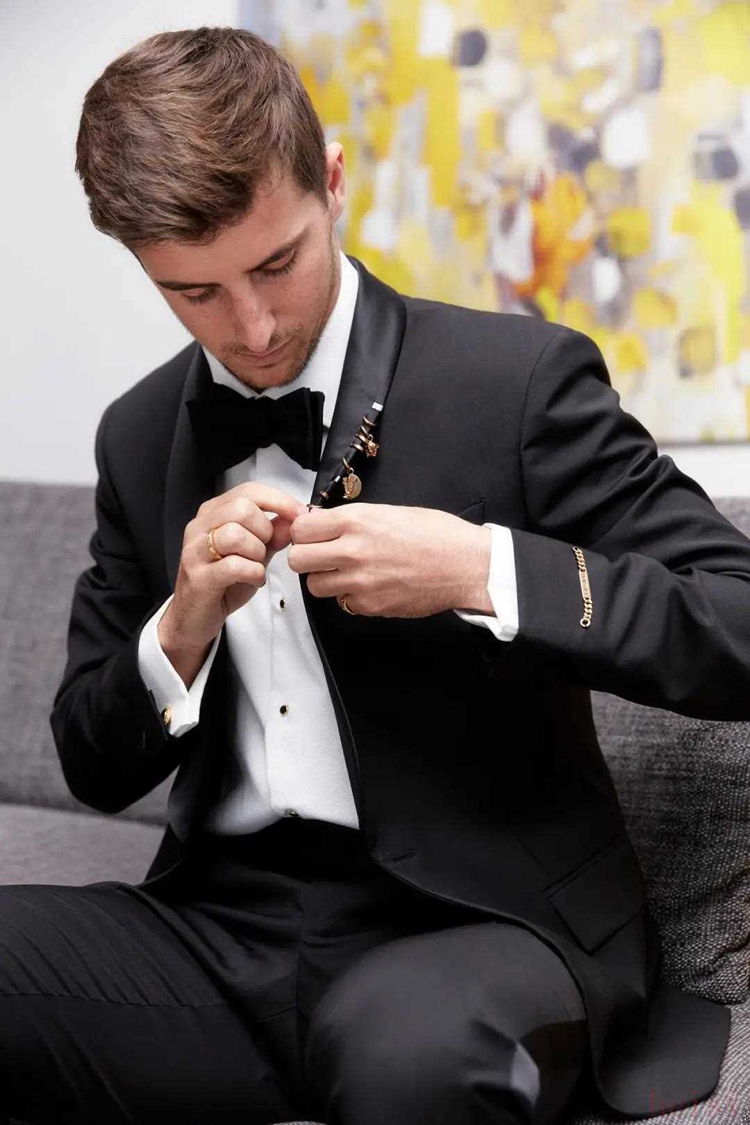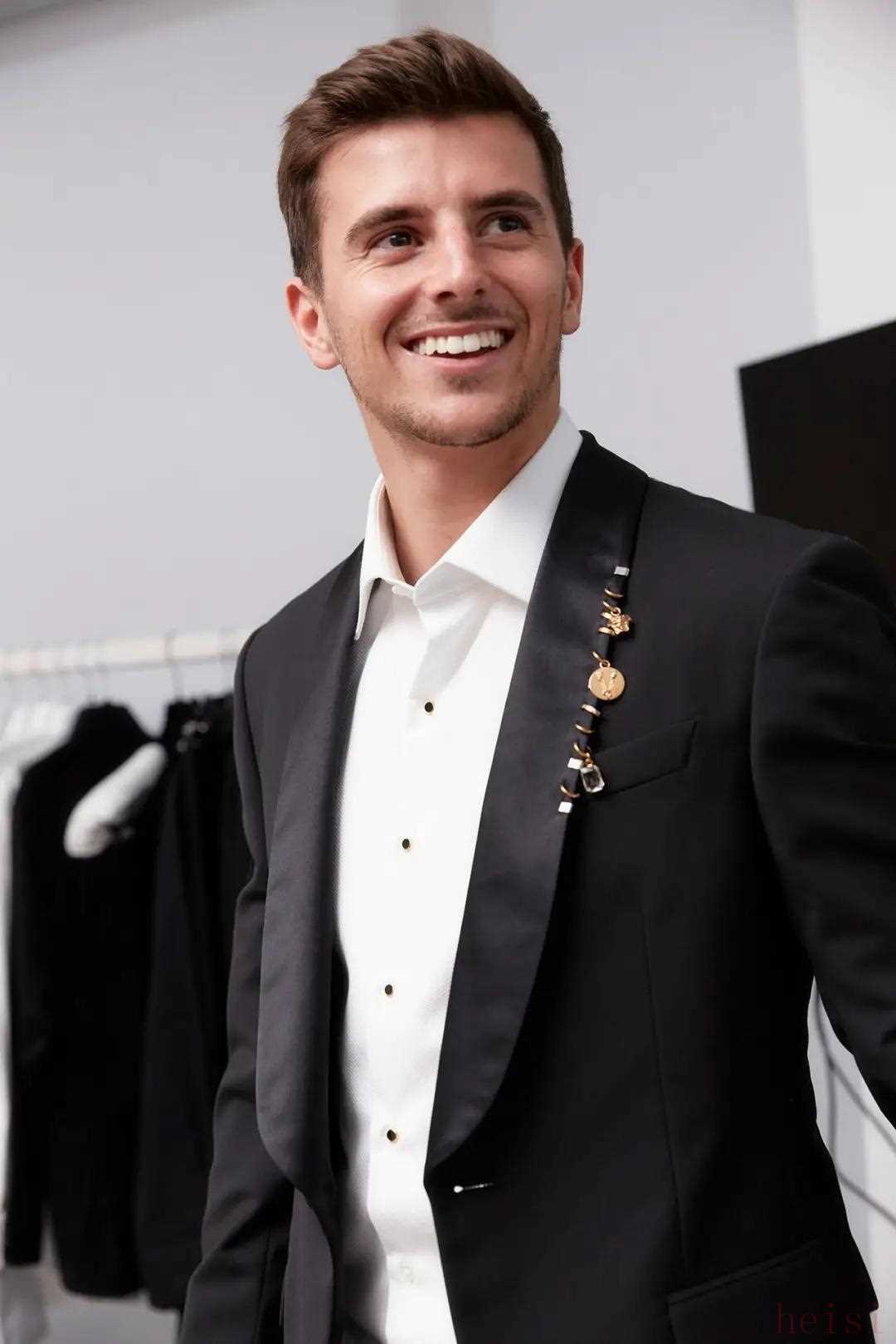 他的这件黑色燕尾服是意大利奢侈品牌范思哲VERSACE 特别设计的,其中也加入了范思哲VERSACE 的品牌招牌设计,加入了纯金和珍珠进行装饰。