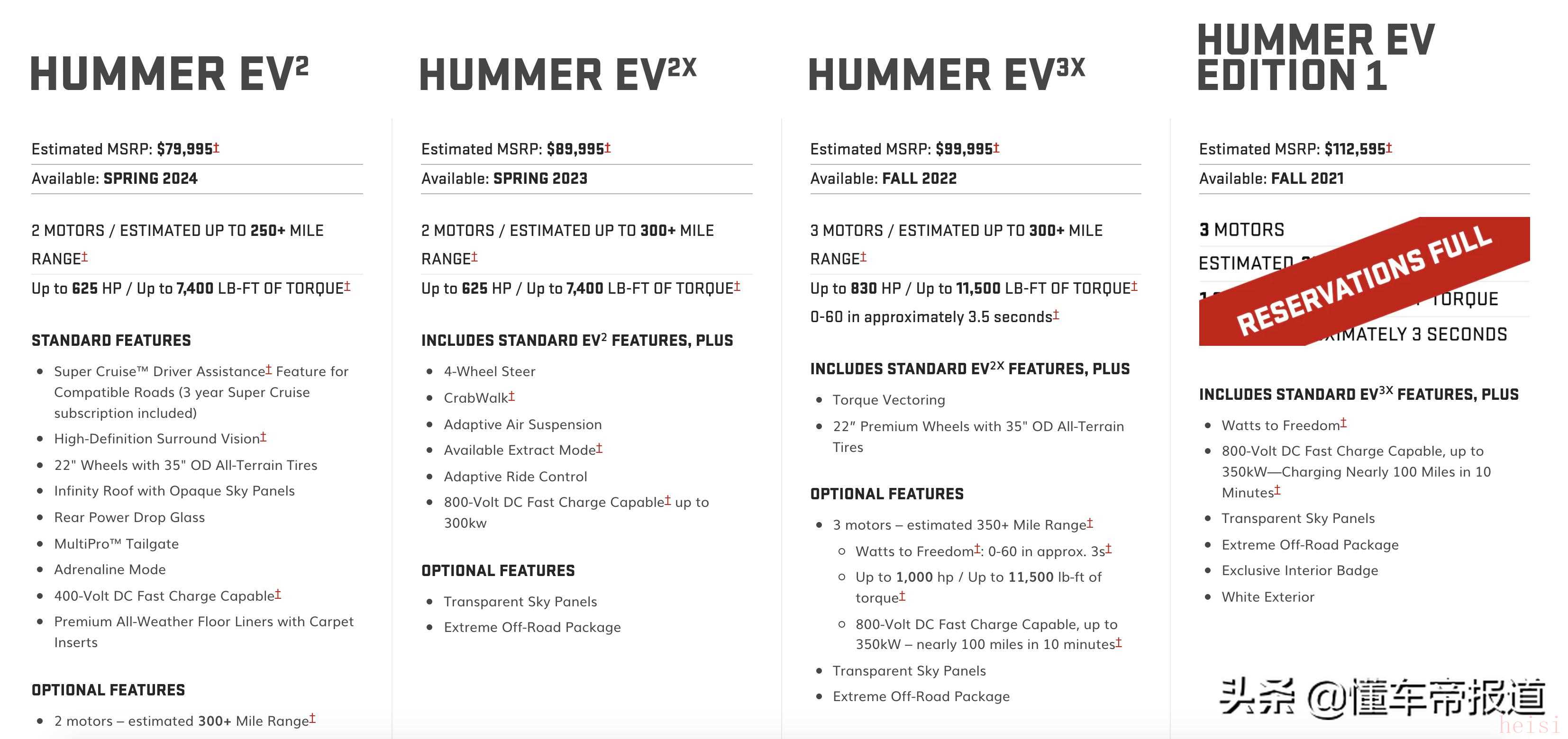 目前,HUMMER EV皮卡已在美国市场开始接受预订。该车推出四款配置可选,分别为HUMMER EV 2、HUMMER EV 2X、HUMMER EV 3X和HUMMER EV EDITION 1。其中,售价最低的HUMMER EV 2报价为79995美元,约合人民币51万元;售价最高的为HUMMER EV EDITION 1报价为112595美元,约合人民币72万元。官网显示,HUMMER EV EDITION 1预订名额已满,计划在今年秋季交付,最晚交付车型为入门版HUMMER EV 2,计划交付日期为2024年。