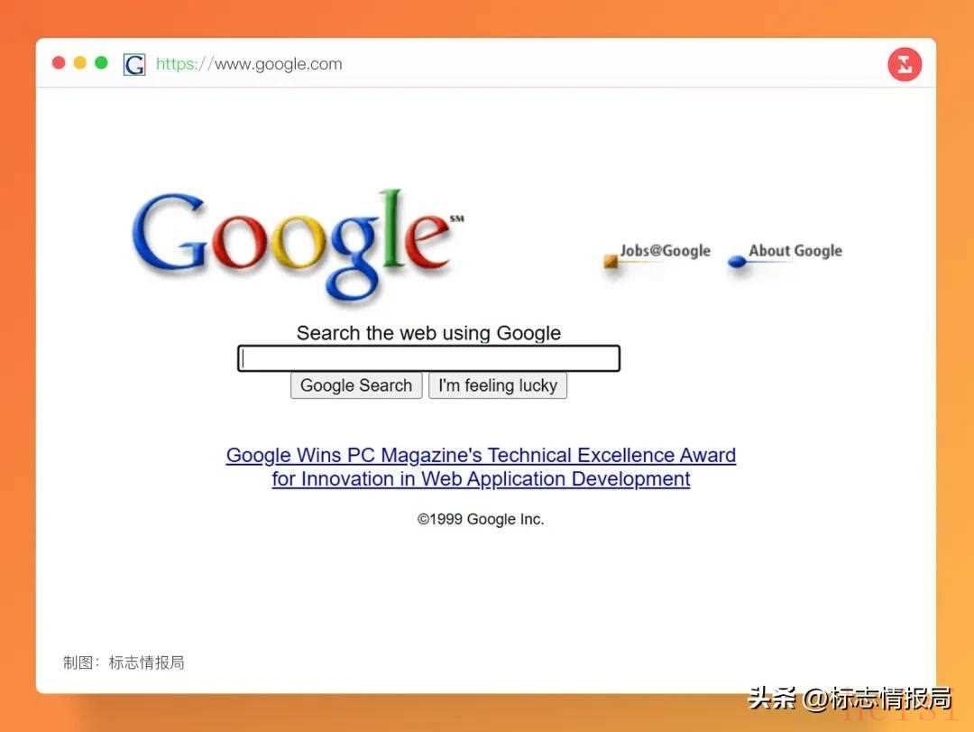 1999年的谷歌首页和浏览器地址栏图标这是 Google 的第一个网页图标,其设计延续了当时品牌 Logo 的衬线字体和配色,是早期互联网时代最具代表性的「小图标」之一。在宽带普及之前,这个小小的 G 出现在用户的浏览器标签和收藏夹中,成为 Google 搜索的快速入口。