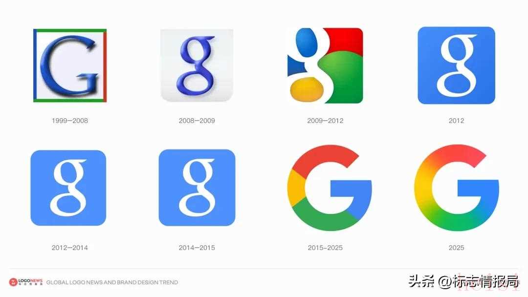 从1999年的蓝色大写 「G」,到 2025 年的渐变「G」,这个小小的图标伴随着 Google 的搜索引擎崛起、移动时代扩张,以及 AI 时代的转型。它不仅是品牌识别的核心符号,更是技术与视觉语言演进的时间刻度。未来,随着 AI 与多模态交互的深入,「G」可能不再只是静态符号,而会承担更多智能交互的入口角色,成为 Google 品牌的动态灵魂。❊文内出现的商标及图像版权属于其合法持有人,只供传递信息之用,非商务用途。如您认为文章内出现的图片或视频内容侵犯到了您的权益,请及时联系我们处理。投诉邮箱:copyright@logonews.cn