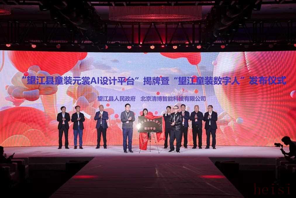 与此同时,为了展现望江树立产业新质生产力典范的坚定决心,活动还举办了望江县童装元裳AI设计平台的揭牌仪式。在纺织产品开发中心主任李斌红,中国纺织工业联合会生产力促进部主任、中国纺织信息中心副主任李波,安庆市市委常委、统战部部长、秘书长徐雄,安庆市政协秘书长、现代纺织服装产业链副链长江兴代,安庆市工业和信息化局党工委书记、局长吴爱德,望江县人大常委会主任吴梅生,望江县政协主席、县纺织服装产业链链长汪森,安徽省纺织行业协会执行会长叶梁,安徽省制衣行业协会秘书长陈洁庚的共同见证下,望江县委副书记、纺织服装产业链副链长朱显璋与北京清博智能科技有限公司联合创始人兼CTO朱旭琪登台为这一望江童装产业智能制造方向的里程碑式平台正式揭牌。