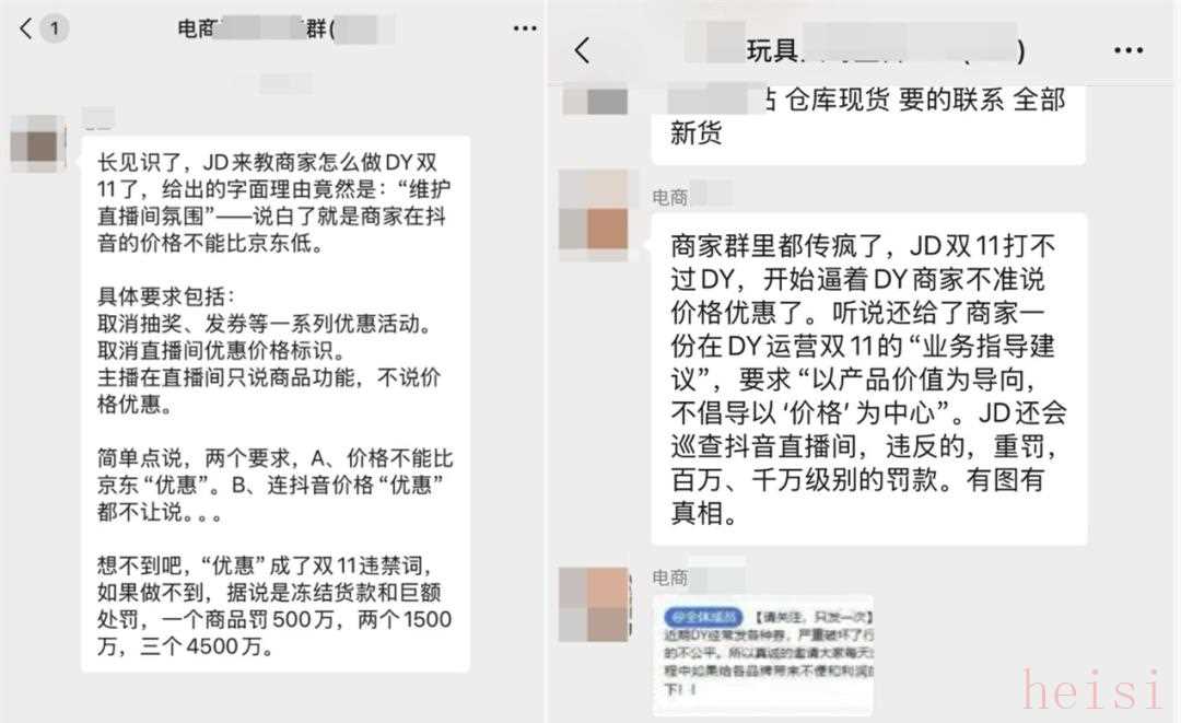但仅仅在两年后,据媒体报道,据抖音电商负责人在朋友圈手撕,今年的双十一,京东要求商家在抖音等其他平台直播时,不能抽奖,也不能发放优惠券,甚至不能打出价格优惠标识。商家一旦被发现“违规”,可能面临数百万元到数千万的高额处罚。