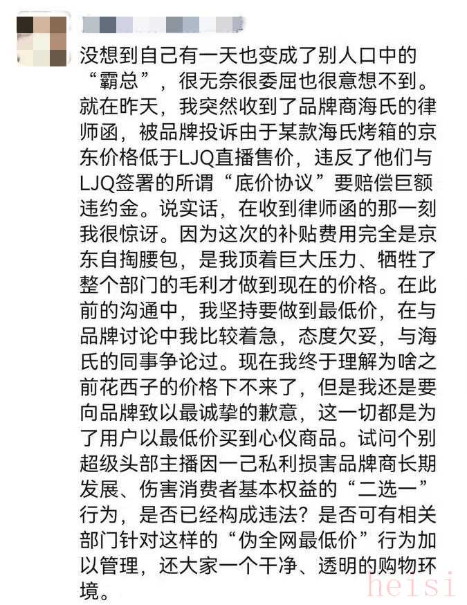 对家的补贴,你不能拿,不能让价格比在我这儿低,这个行为涉嫌什么?是不是参考下两年前京东采销的那条朋友圈就行?3尽管四年前,国家市场监管总局对阿里巴巴反垄断案中确立的违法认定标准就包括,“禁止平台内经营者在竞争平台开店或参加促销活动”。但京东否认自己在“二选一”,有京东内部人士接受媒体采访的时候说,“京东要求在自己平台上的售价不能高于其他平台,这种做法是确保销量大的平台价格具有竞争力,让大多数消费者购买到合适的价格。这种主动比价是为消费者构筑价格防护墙”。这段话我读了好几遍,起初觉得这是什么奇怪的逻辑,为了不让多数人选择后悔,所以让少数人没有这个更便宜的选项。奇怪的让人想起王员外心善,见不得穷人。后来读着读着我忽然有点儿心酸,这就是打工人的处境,把你放在问题的那个位置上,什么话你都得说。如果墨镜王在最初的亮相里,就像今天努力做视频号的王晶那样,大嘴一张,也许他今天都没有什么太大的舆论困境可言。如果京东在两年前,没有想站在道德高地贴着李佳琦打,没有发那言之凿凿的朋友圈,也不会有今天面对二选一左右互搏的表态。面对这两段表态,内心真的感觉拧巴的其实不是我们这些看客,而是在这家公司工作的人。他们会怎么思考自己的公司,会怎么判断公司现在的处境?会怎么面对公司的价值观和承诺?无论是一个人,还是一家公司,商业的困境许是外力推动的,舆论的困境一定是自己设置的。
