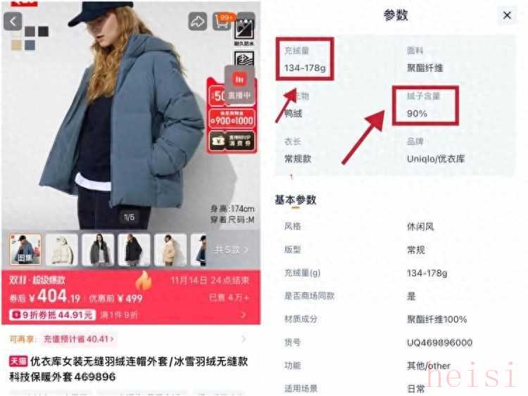 网购羽绒服,同样要查看详情页的填充物重量及品质介绍(网页截屏)