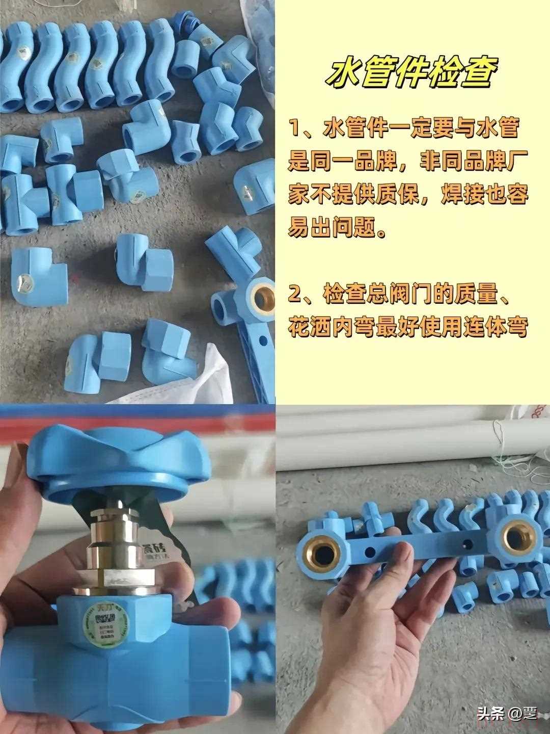 水管件检查:1、水管件一定要与水管是同一品牌,非同品牌厂家不提供质保,焊接也容易出问题。2、检查总阀门的质量,花洒内弯最好使用连体弯。首选伟星PPR双层热水管,壁厚2.8以上,大弧弯、顺水三通。