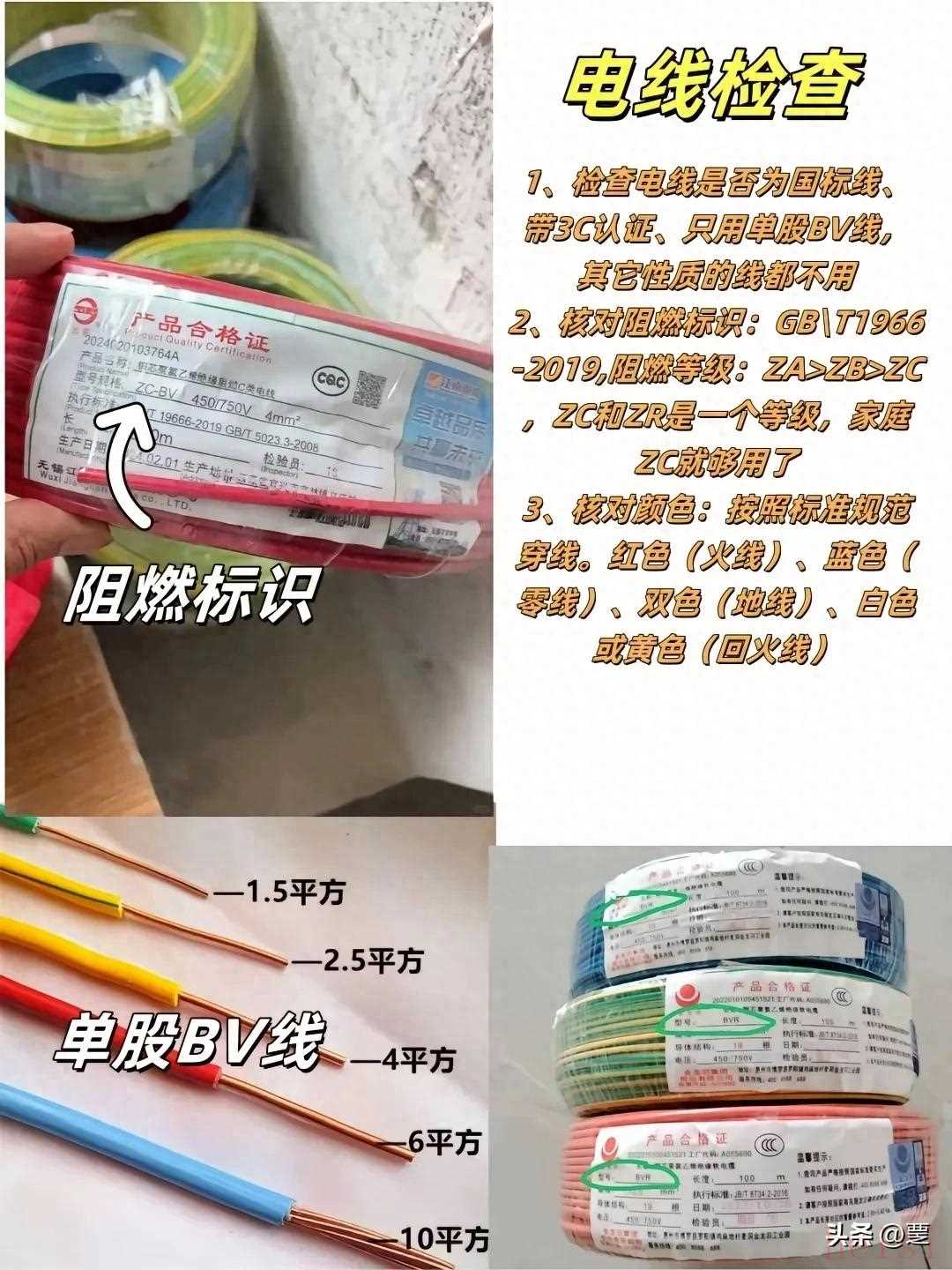 电线检查:检查电线是否为国标线、带3C认证、只用单股BV线,其它性质的线都不用;核对阻燃标识:GB/T1966-2019阻等级:ZA>ZB>ZC,ZC别ZR是一个等级,家庭ZC就够用了;核对颜色:按照标准规范穿线,红色(火线)、蓝色(零线)、双色(地线)、白色或黄色(回火线)。首选ZC-BV或ZR-BV。