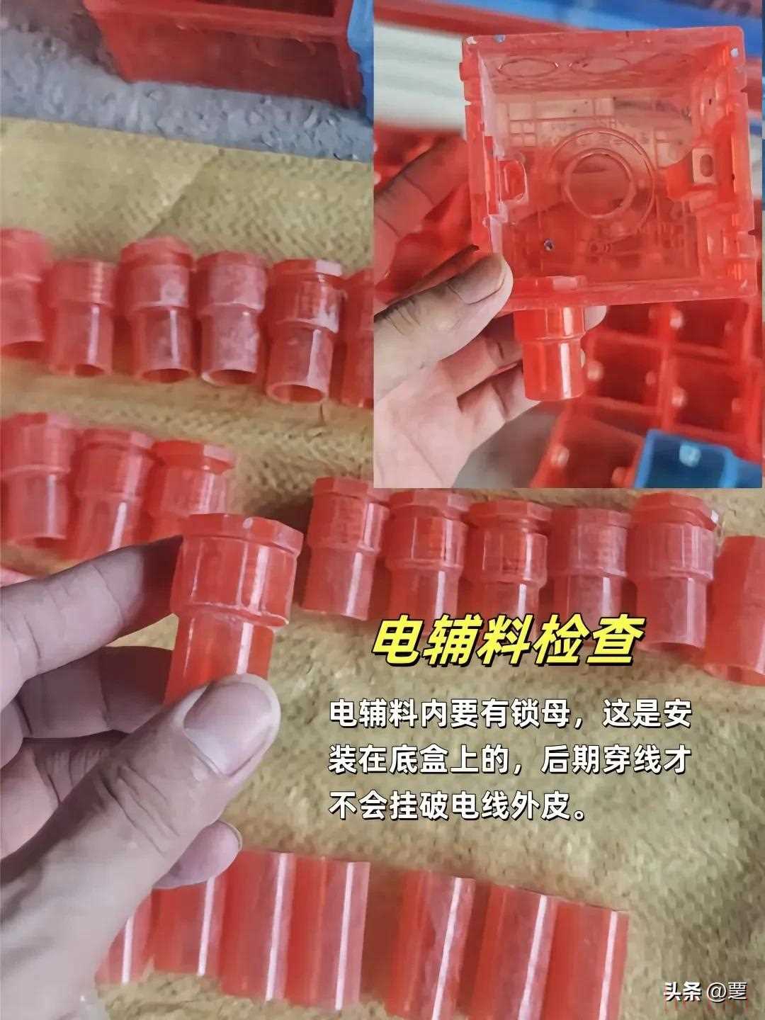 电辅料检查:电辅料内要有锁母,这是安装在底盒上的,后期穿线才不会挂破电线外皮。1、绝缘PVC胶带是包裹并线的线头的。2、绝缘布胶带是包裹在PVC胶带外侧的,起来防老化的作用,用电更安全。3、黄腊管的作用是套在灯线外侧,起来保护电线、绝缘的作用。