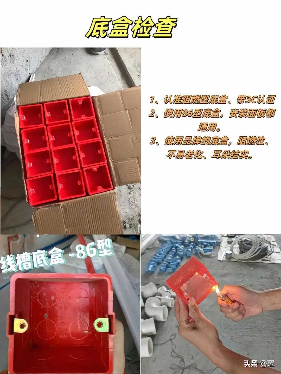底盒检查:1、认准阻燃型底盒、带3C认证。2、使用86型底盒,安装面板都通用。3、使用品牌的底盒,阻燃性不易老化、耳朵结实。首选伟星,智能开关底盒深度大于5公分,弱电箱一定要换一个大的,留插线板,放路由器。
