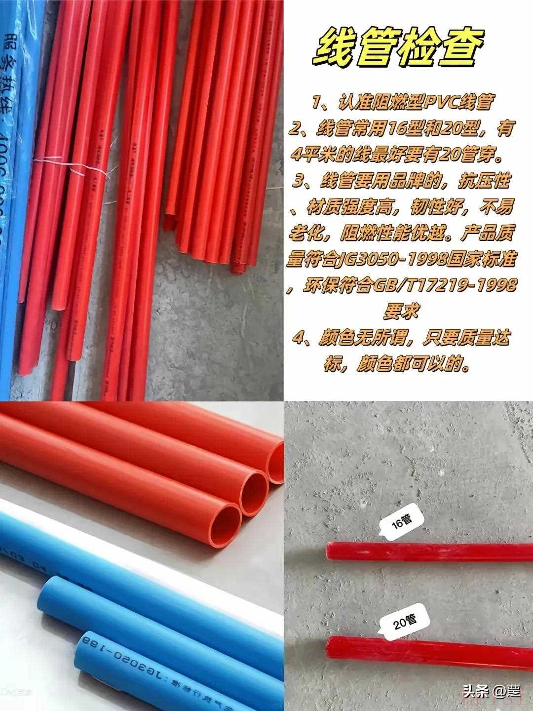 线管检查:1、认准阻燃型PVC线管。2、线管常用16型和20型,有4平米的线最好要用20管穿。3、线管要用品牌的,抗压性材质强度高,初性好,不易老化,阻燃性能优越。产品质量符合G3050-1993压家标准环保符合GB/T17219-1995要求。4、颜色无所谓,只要质量达标,颜色都可以的。首选伟星4分管,卡扣要用不锈钢的。