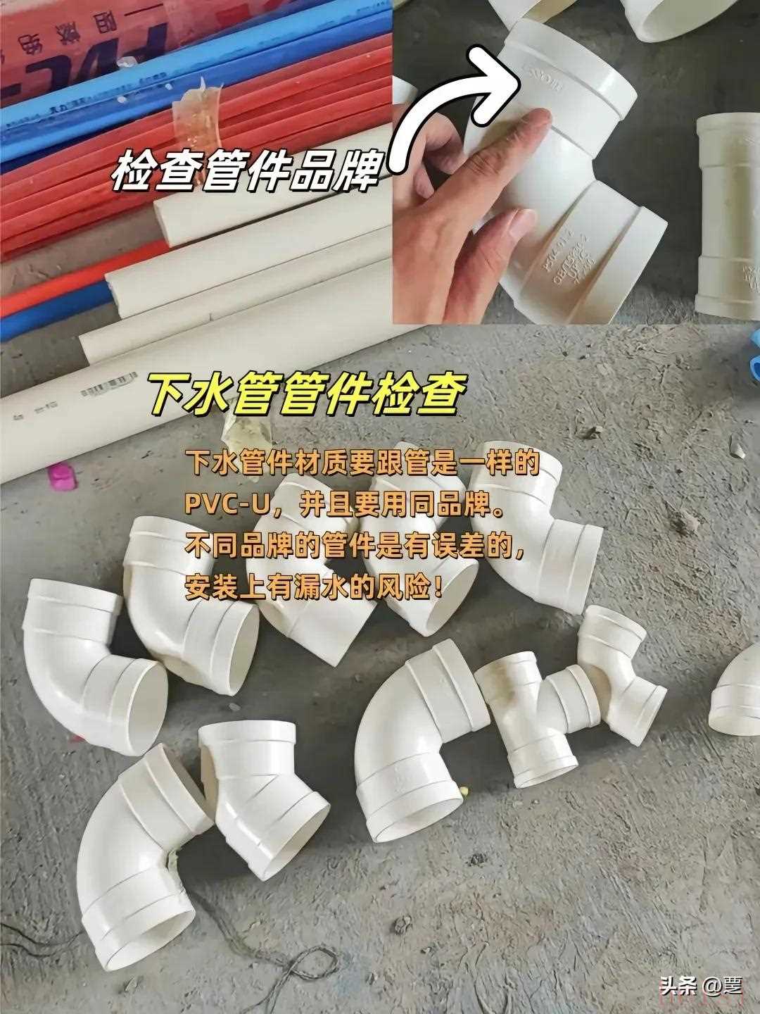 下水管管件检查:下水管件材质要跟管是一样的PVC-U,并且要用同品牌。不同品牌的管件是有误差的,安装上有漏水的风险!首选首选伟星PVC-U材质。
