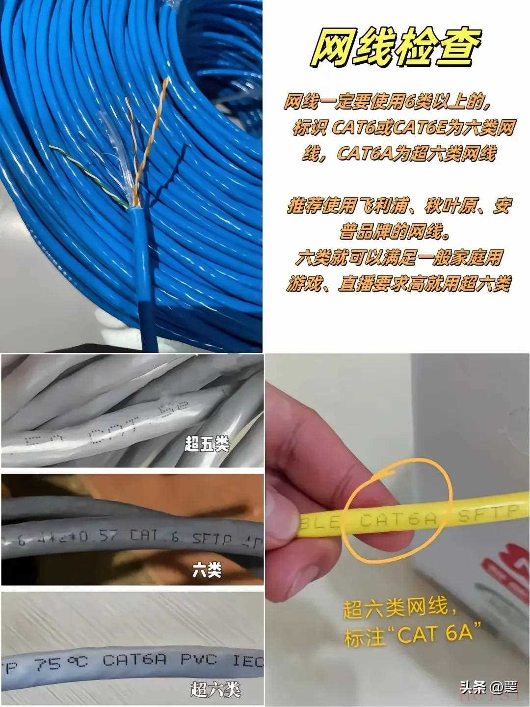 网线检查:网线一定要使用6类以上的,标识 CAT6或AT6E为六类网线,CAT6A为超六类网线;推荐使用飞利浦、秋叶原、安普品牌的网线。六类就可以满足一般家庭用游戏、直播要求高就用超六类。首选CAT6A超六类网线。