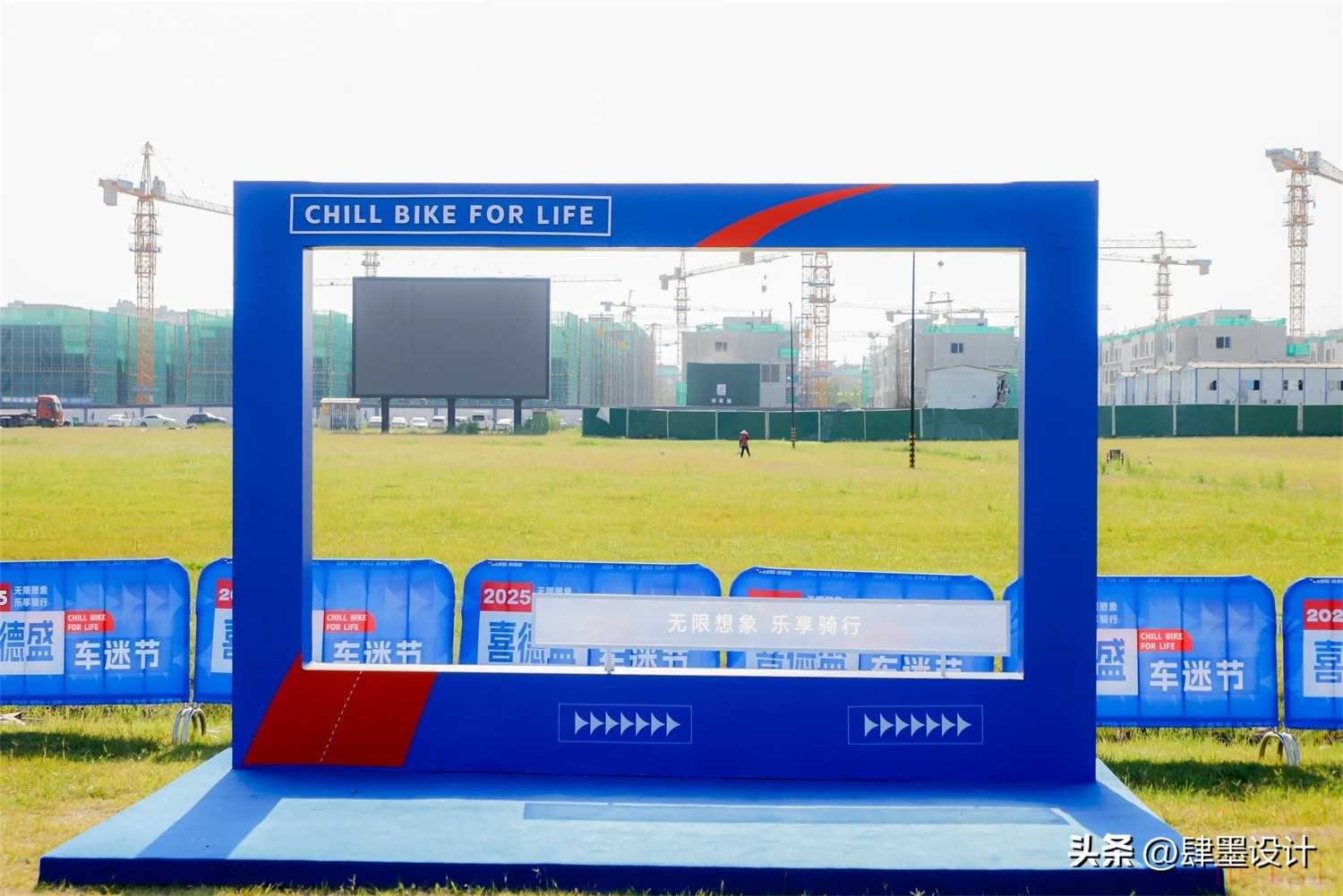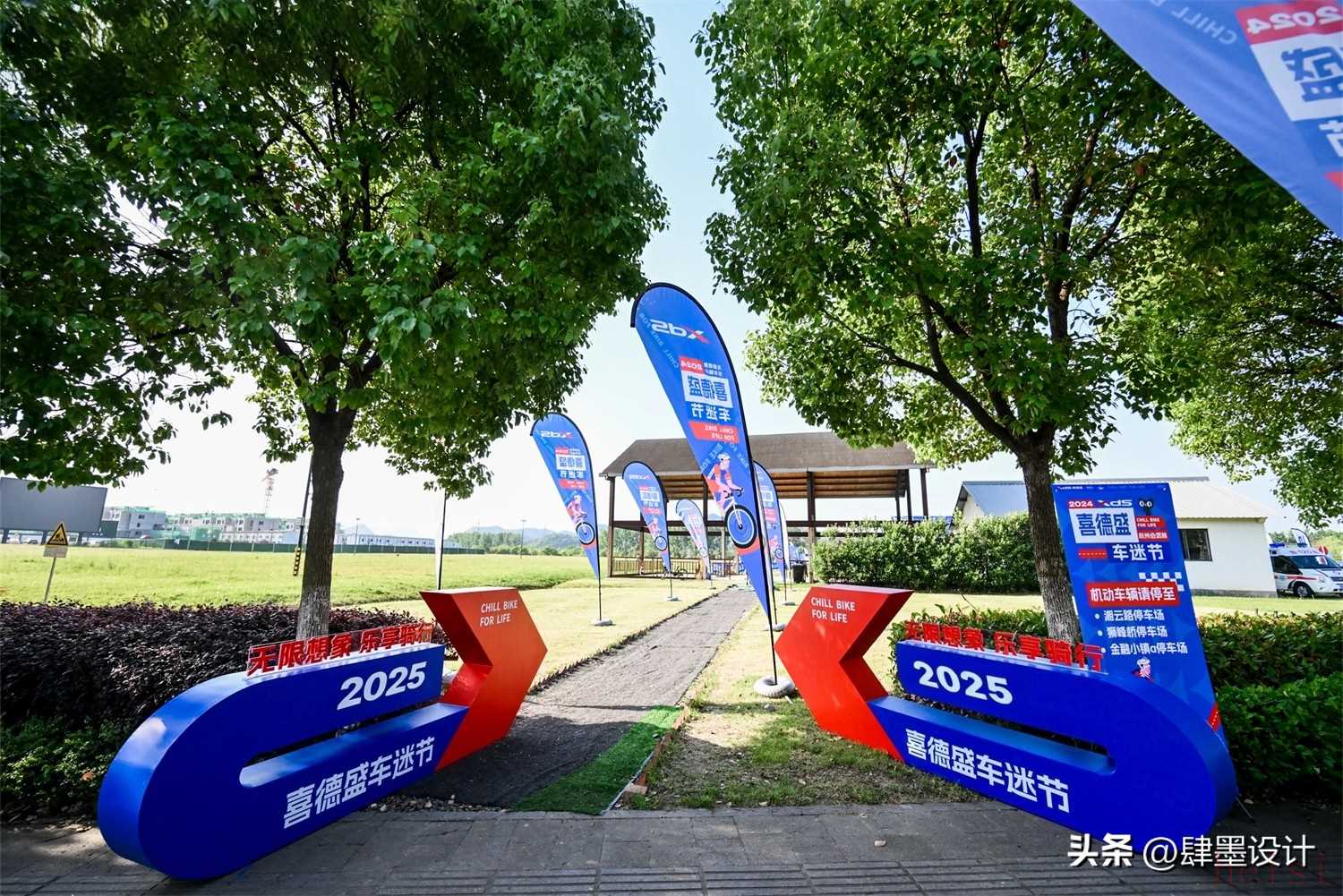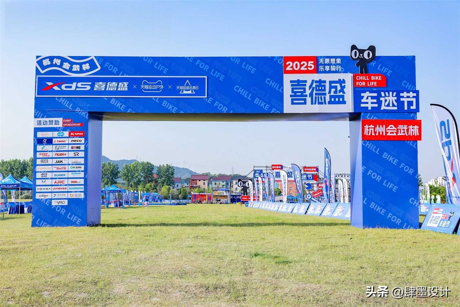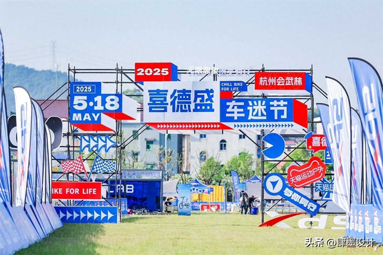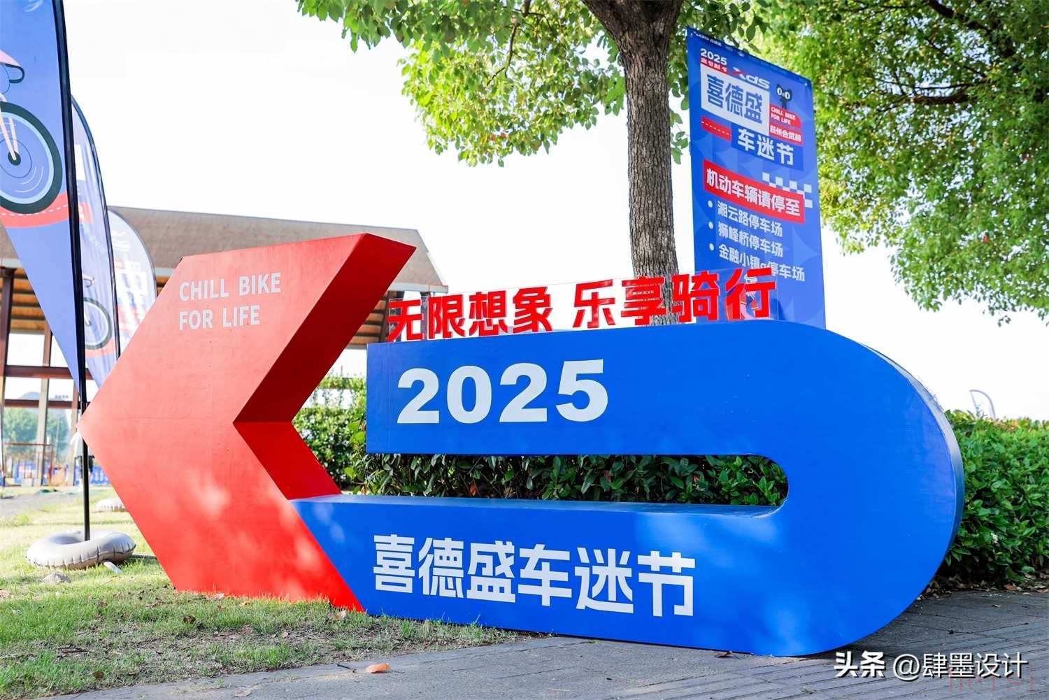 01 设计风格:动感与现代时尚的融合喜德盛巡回车迷节主题展线下快闪活动的整体设计风格呈现出活力动感与现代时尚的完美融合。从活动现场的布置来看,大量运用了简洁明快的线条和几何形状,如拱门、箭头等元素,营造出一种充满动感和前进感的氛围。这种设计风格不仅契合了自行车运动的速度与激情,也符合现代消费者对于时尚、简约的审美追求。例如,活动入口处的“2025喜德盛车迷节”大型箭头标识,以红蓝两色的强烈对比和独特的造型,瞬间吸引了人们的视线,成为活动现场的视觉焦点之一。