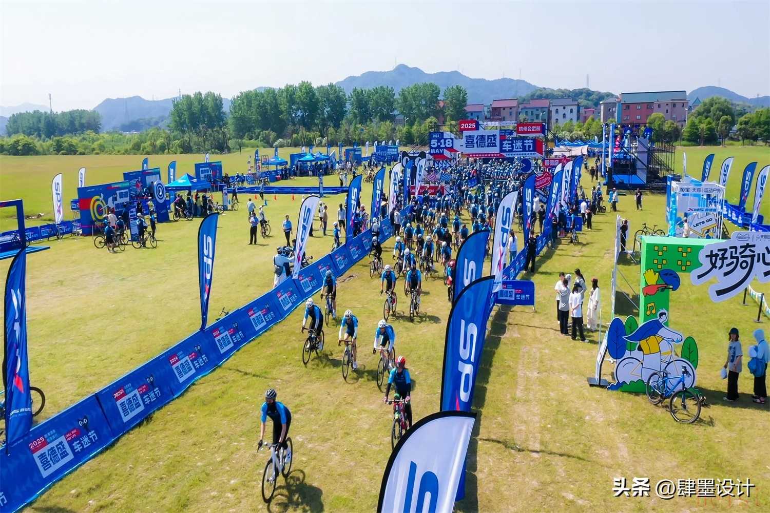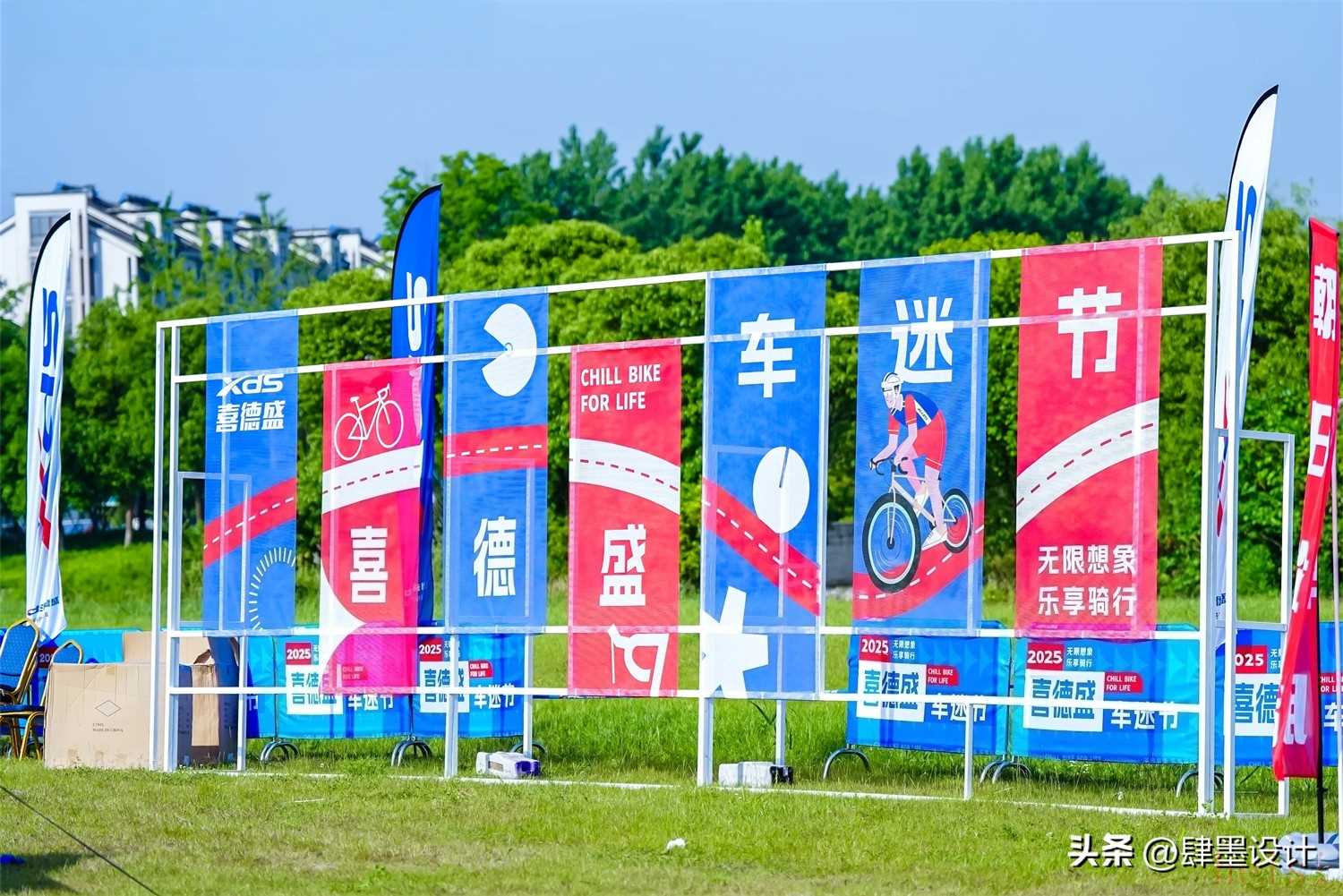 03 整体色彩:鲜明对比与活力激情碰撞在色彩运用上,活动采用了鲜明的对比色,如红蓝、蓝白等,营造出强烈的视觉冲击力。红色代表着热情、活力,蓝色象征着科技、专业,两者的结合既体现了自行车运动的激情与活力,又展示了喜德盛品牌的专业性。这种色彩搭配不仅使活动现场在户外环境中格外醒目,吸引路人的关注,还能让参与者在视觉上感受到强烈的活力与激情,激发他们对自行车运动的兴趣。像活动现场的旗帜、标识牌等,都大量使用了红蓝配色,形成了统一的视觉形象。