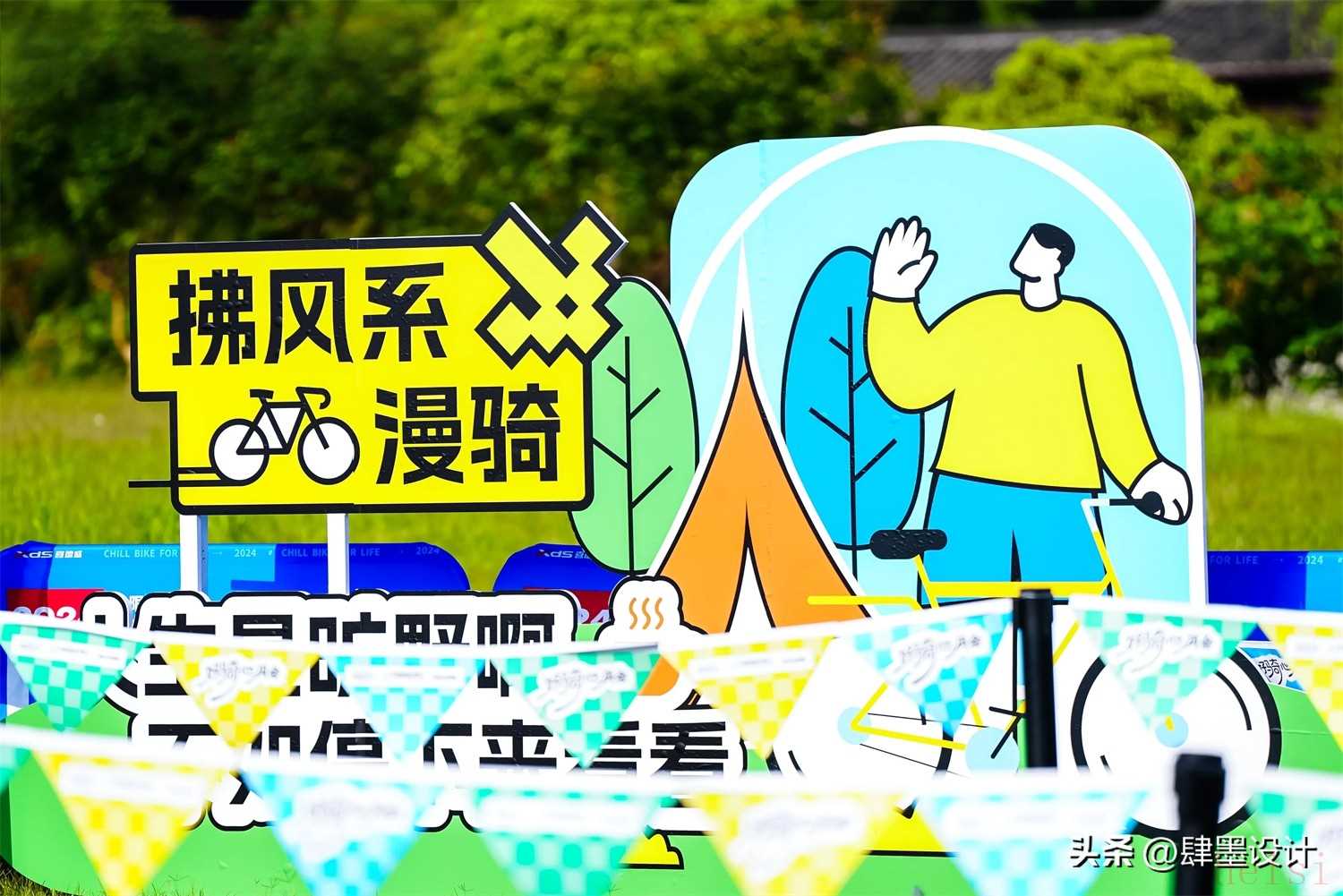 02 主题元素:自行车文化的深度诠释主题快闪元素设计围绕自行车文化展开,深度诠释了喜德盛的品牌内涵。现场随处可见的自行车图案、骑行者形象以及与自行车相关的装饰元素,如车轮造型的路标等,都在不断强化自行车这一主题。这些主题元素不仅让消费者一眼就能感受到浓厚的自行车氛围,更通过巧妙的布置和设计,将喜德盛品牌与自行车文化紧密相连,加深了消费者对品牌的认知和认同感。比如“好骑心风会”的拱门设计,以绿色为背景,搭配骑行的卡通人物,生动地展现了骑行带来的快乐和自由。
