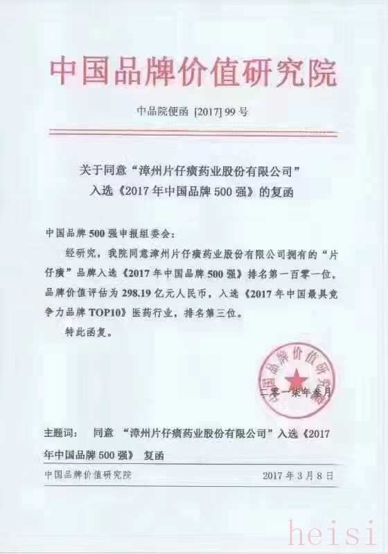 3月初,片仔癀入选“2017年中国品牌500强”一百零一位,品牌估值298.19亿元人民币。入选“2017年中国最具竞争力品牌TOP10”医药行业,排名第三。这是片仔癀连续三度蝉联中国品牌500强榜单。