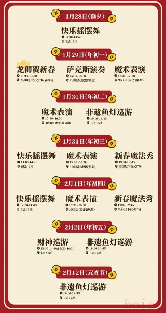 2月12日前,非遗鱼灯巡游、快乐摇摆舞、新春魔法秀、财神巡游等演出活动轮番上演,带你感受传统与年味交融的魅力。非遗过大年·艺术剧巡演将于2月9日精彩呈现。