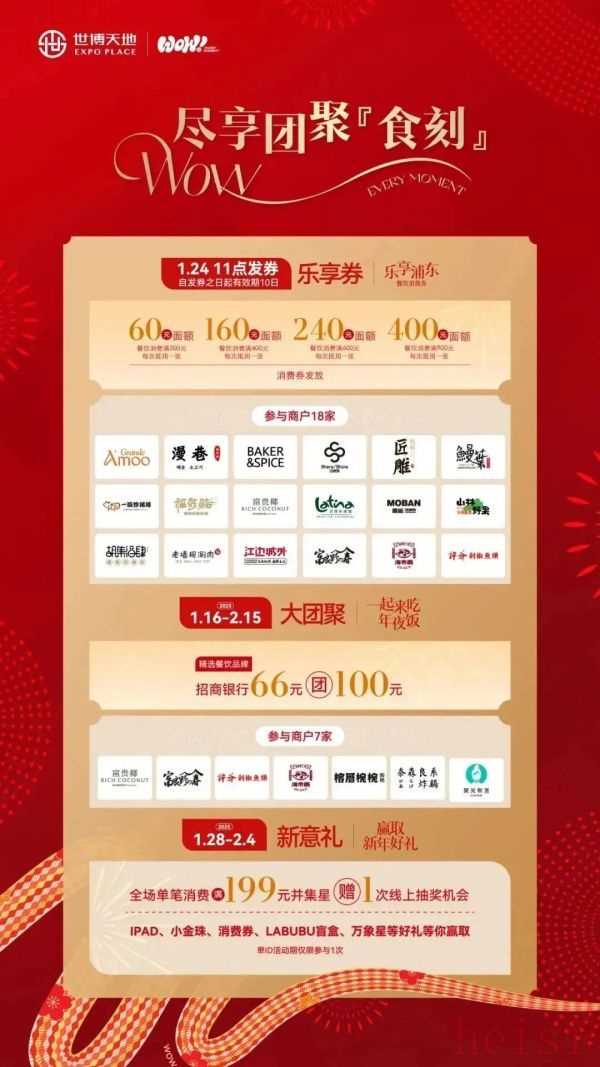 春节期间,世博天地全场近30家餐饮租户限时解锁千万级浦东餐饮消费券。即日起至2月4日,消费满199元即可参与线上抽奖。金珠、平板、无门槛现金券……2月15日前,更有银行66团100餐饮超值活动!超多新春好礼等你来解锁!
