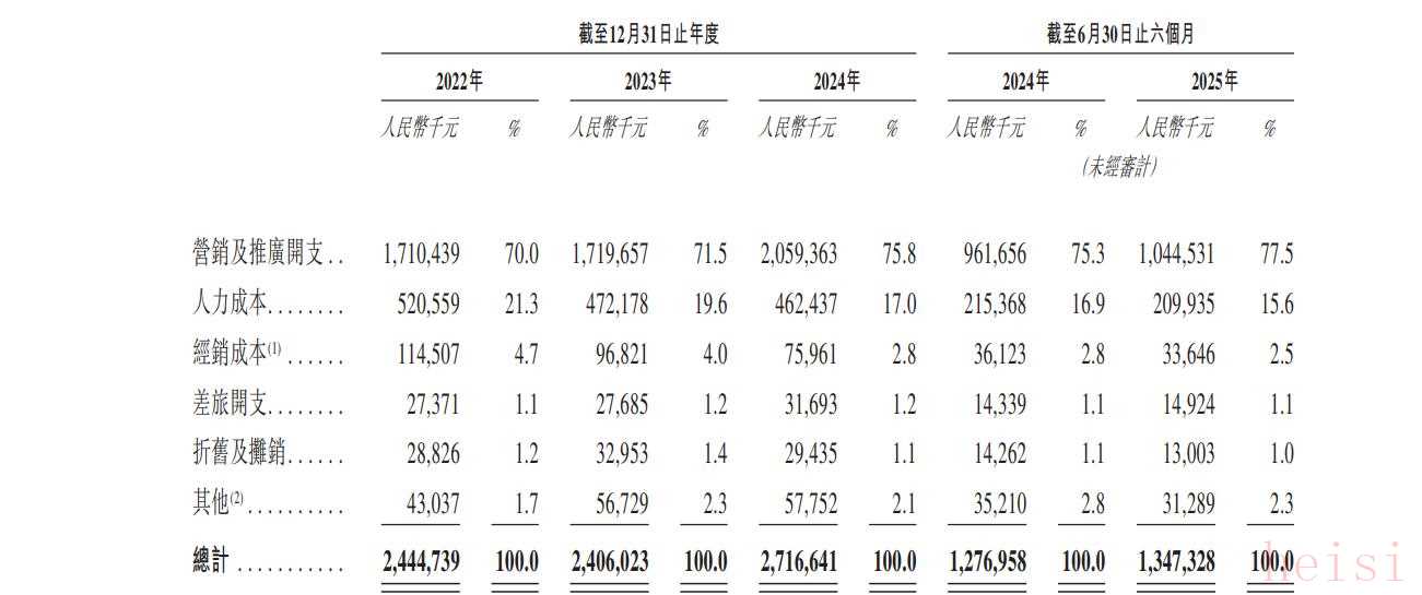 招股书显示,自然堂的销售及营销成本包括营销及推广开支、人力成本、经销成本、差旅开支、折旧及摊销等。2022年-2024年,该公司销售及营销成本分别约24.45亿元、24.06亿元和27.17亿元,约占其全年收入的57%、54.2%以及59%。也就是说,该公司有过半收入用于销售及营销。