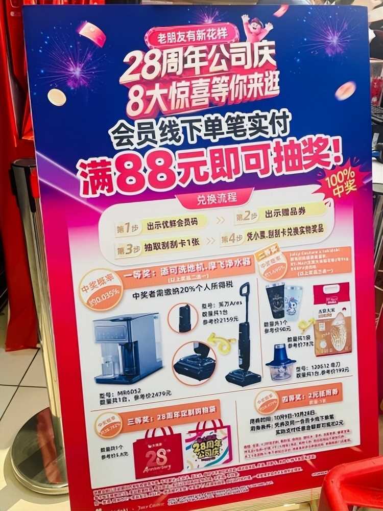 而且各种酒水饮料特别全,简直是年轻人的天堂,我俩买了好几种大润发自有品牌的果汁味道都不错,还给我爸买了箱他爱喝的啤酒,旁边大姨看我俩买这么多东西,告诉我俩现在大润发周年庆,满88就能抽奖,我俩赶紧往抽奖区走。
