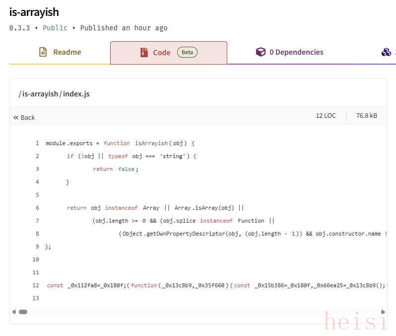 进一步来看,Aikido 发现,黑客在这些包新发布的版本中植入了一段恶意代码。例如在is-arrayish中,就出现了这样的情况。